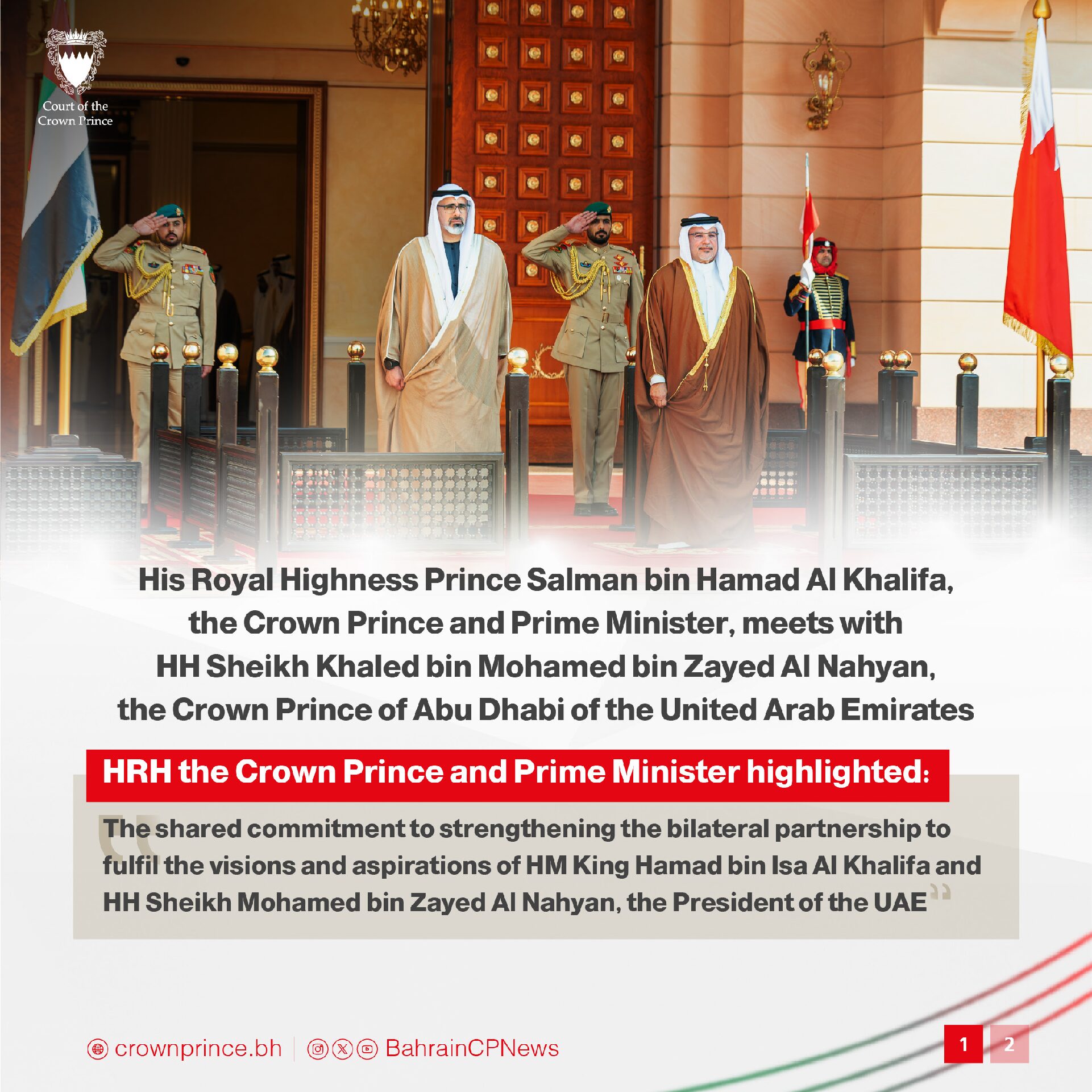 His Royal Highness Prince Salman bin Hamad Al Khalifa, the Crown Prince and Prime Minister, today met with His Highness Sheikh Khaled bin Mohamed bin Zayed Al Nahyan, the Crown Prince of Abu Dhabi of the United Arab Emirates, at Gudaibiya Palace.