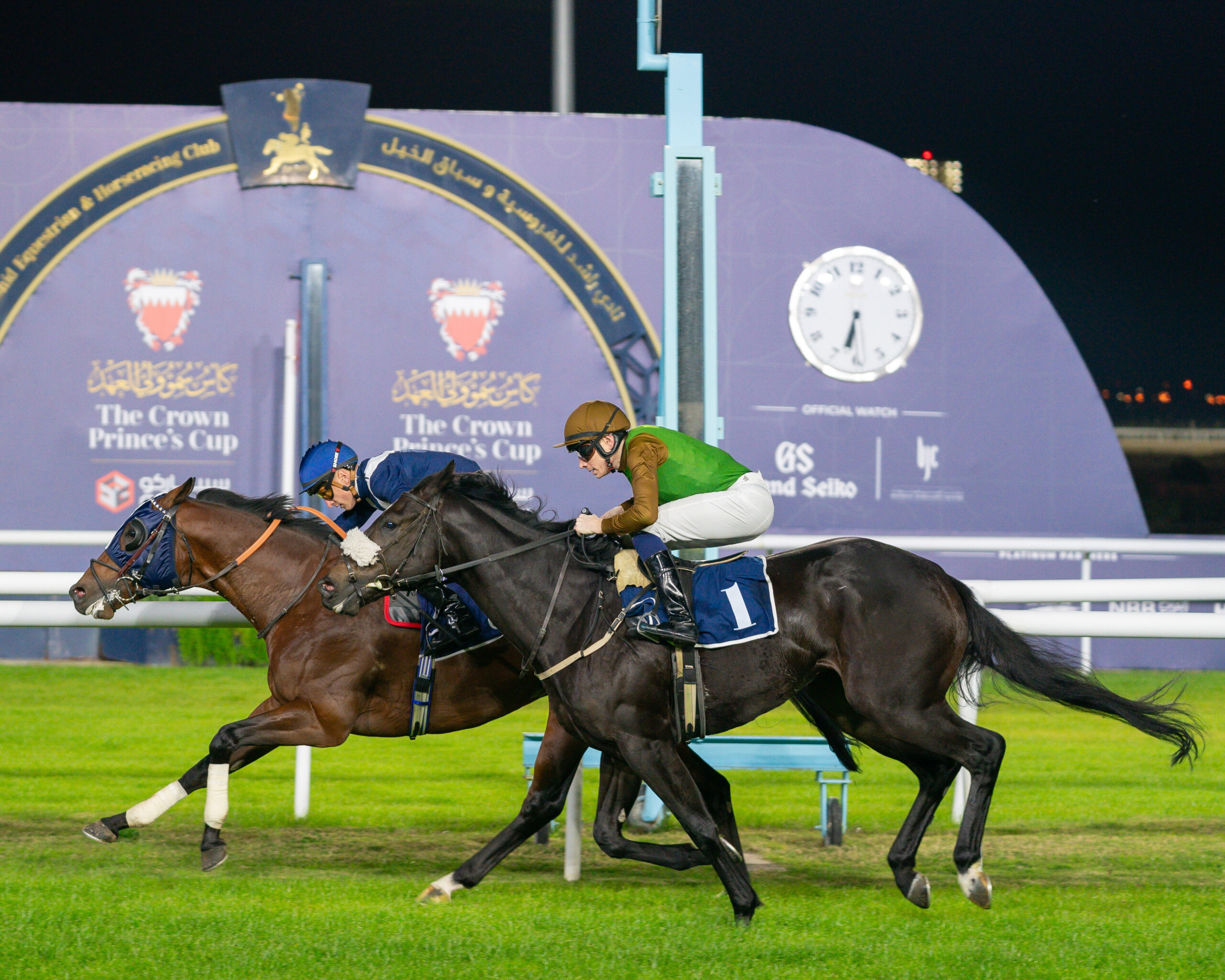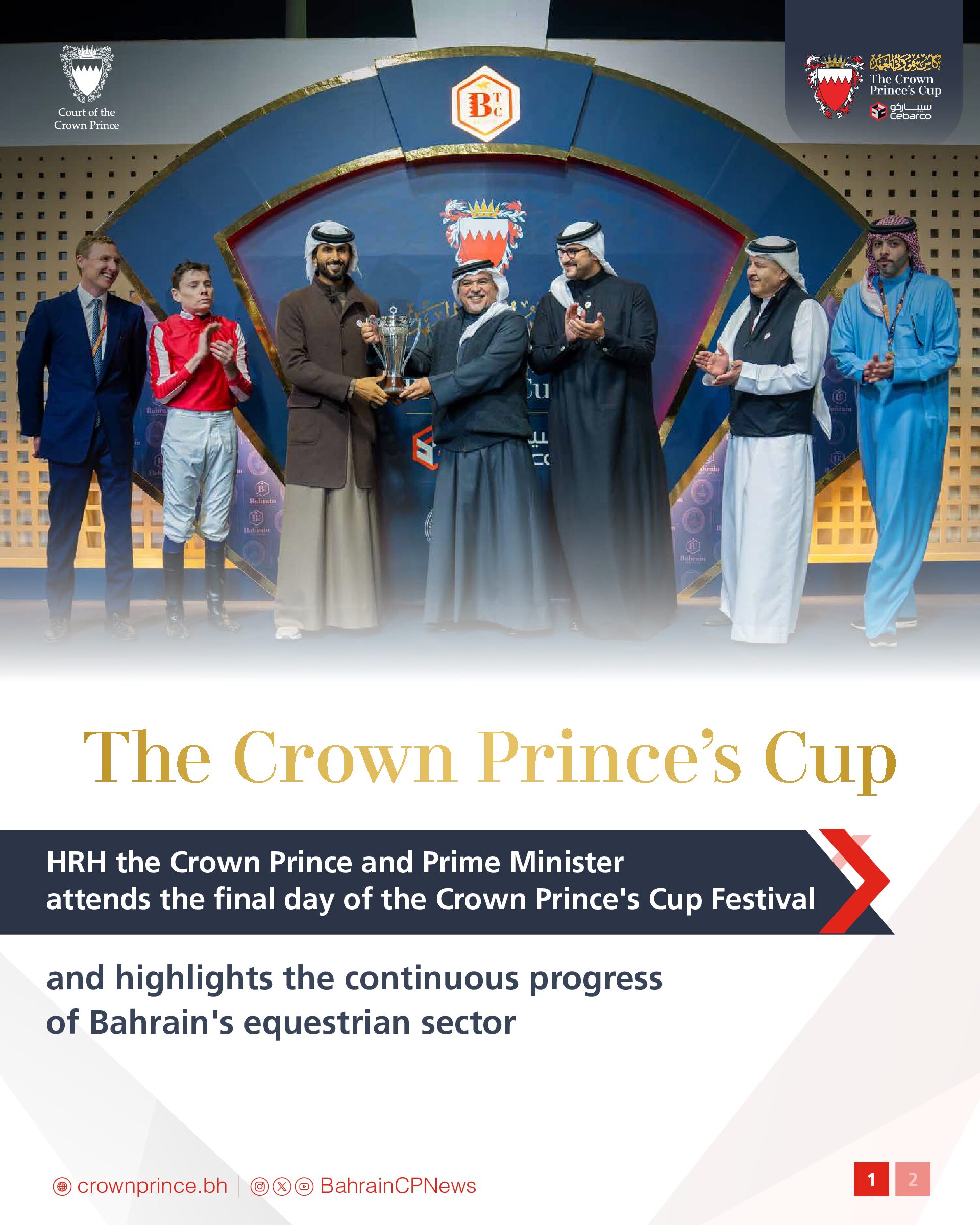 His Royal Highness the Crown Prince and Prime Minister delegated His Highness Shaikh Nasser bin Hamad Al Khalifa to present the Crown Prince’s Cup for locally produced horses to His Highness Shaikh Hamad bin Abdullah bin Isa Al Khalifa, and His Royal Highness delegated His Highness Shaikh Isa bin Salman bin Hamad Al Khalifa to present the Crown Prince’s Cup for Arabian horses to the winning trainer Abdulla Kuwaiti.