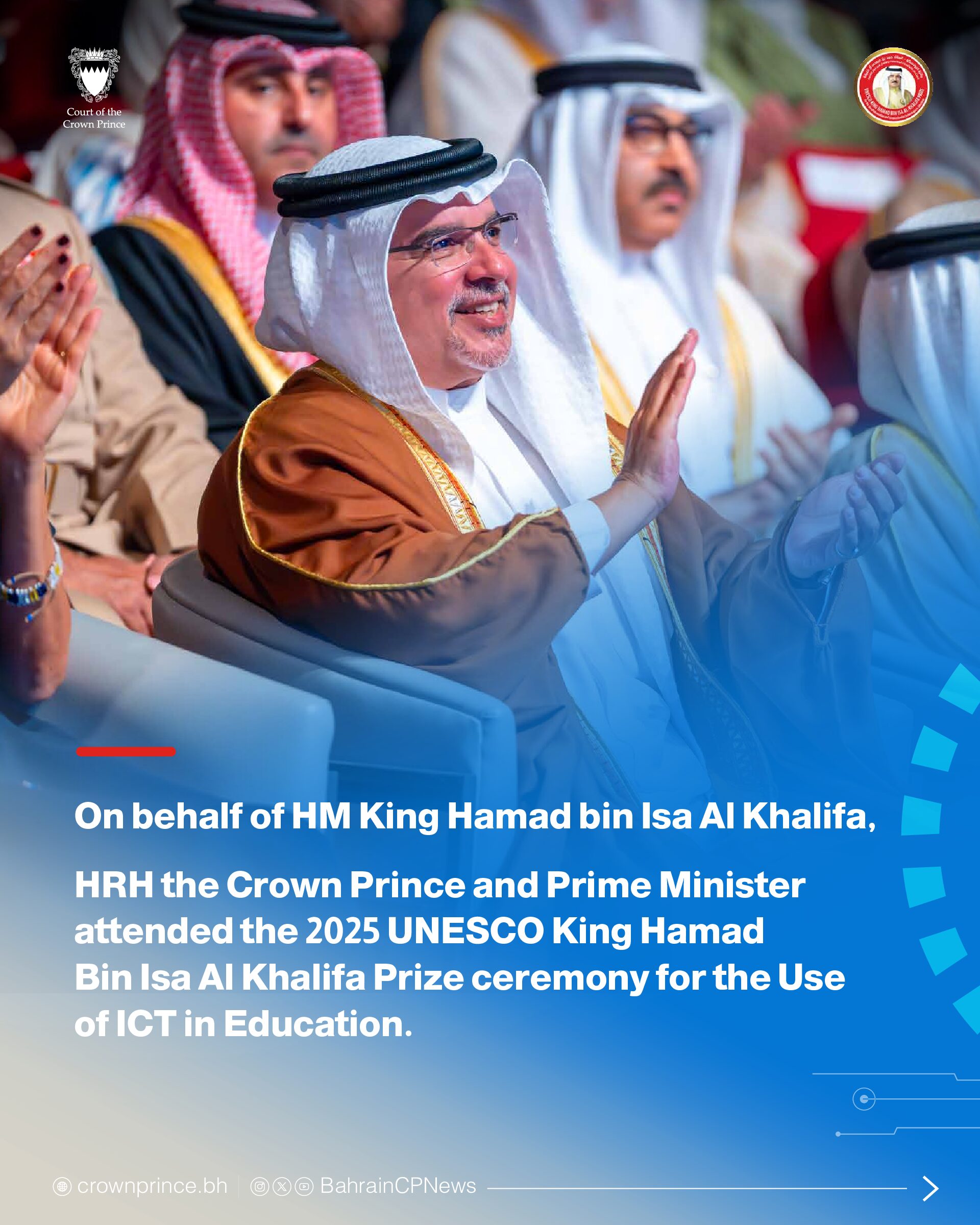 On behalf of His Majesty King Hamad bin Isa Al Khalifa, His Royal Highness Prince Salman bin Hamad Al Khalifa, the Crown Prince and Prime Minister, today attended the award ceremony of the 2025 UNESCO King Hamad Bin Isa Al Khalifa Prize for the Use of Information and Communication Technologies in Education. The award ceremony was held at the University of Bahrain, representing the first occasion the award has taken place outside UNESCO’s headquarters in Paris.