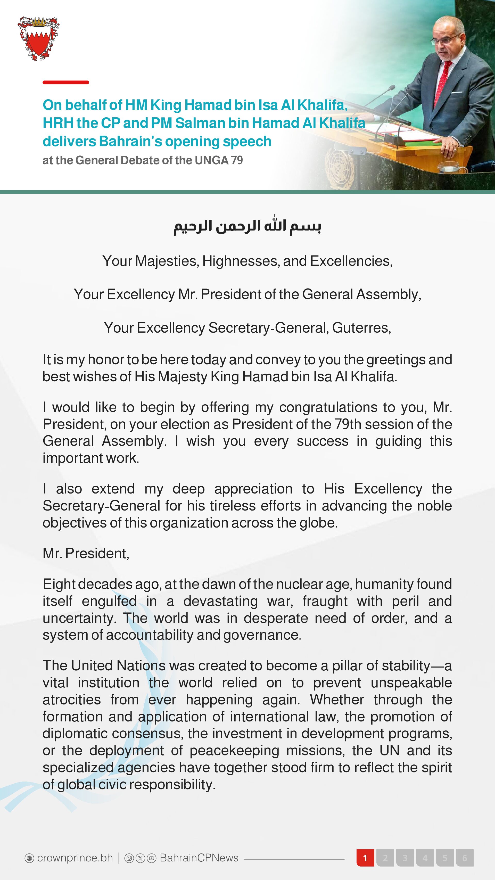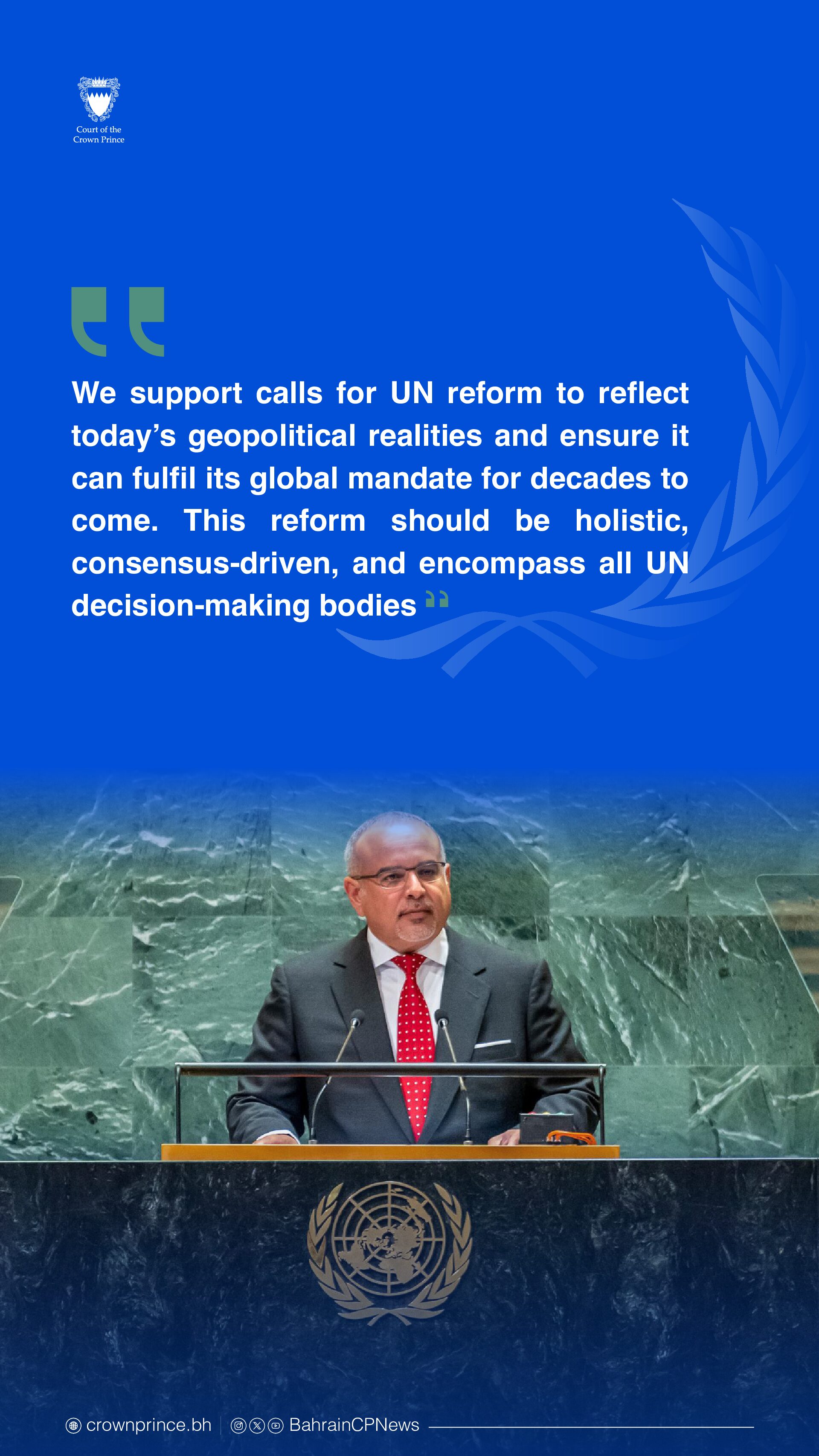 His Majesty the King has also called on the international community to convene an international peace conference on the Middle East. As the current holder of the Arab League presidency, the Kingdom of Bahrain urges all nations to join us this vital initiative, which seeks to strengthen efforts to achieve a just, comprehensive, and lasting peace in the region.