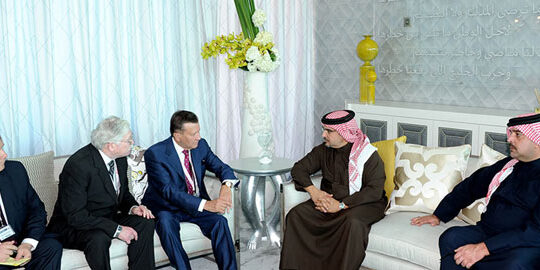 رحب صاحب السمو الملكي الأمير سلمان بن حمد آل خليفة ولي العهد نائب القائد الأعلى النائب الأول لرئيس مجلس الوزراء بالسيد فيكتور زوبكوف الممثل الخاص لرئيس روسيا الاتحادية لمنتدى الدول المصدرة للغاز و ورئيس مجلس ادارة شركة غاز بروم الروسية الذي يزور مملكة البحرين حالياً بمناسبة معرض البحرين الدولي للطيران 2014.