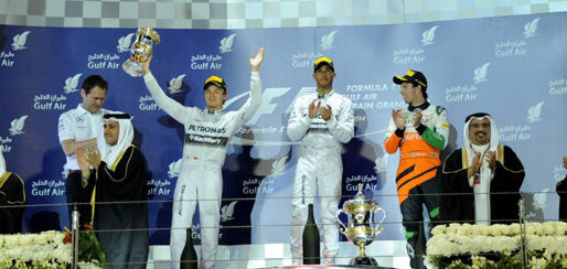 سمو ولي العهد يتوج الفائزين بسباق جائزة البحرين الكبرى لطيران الخليج للفورمولا واحد 2014