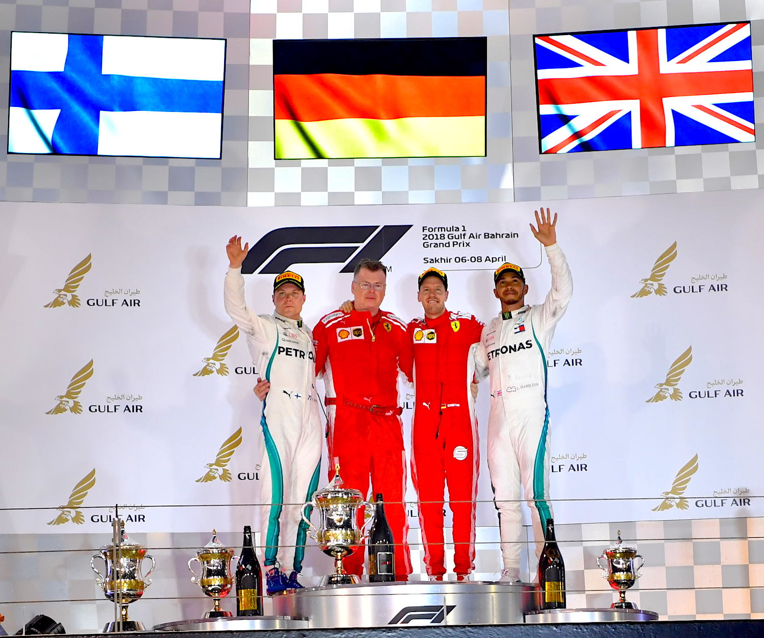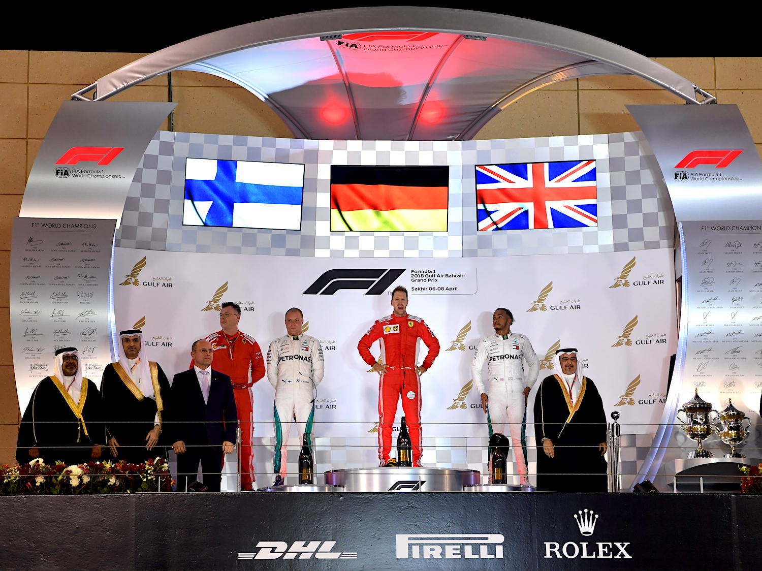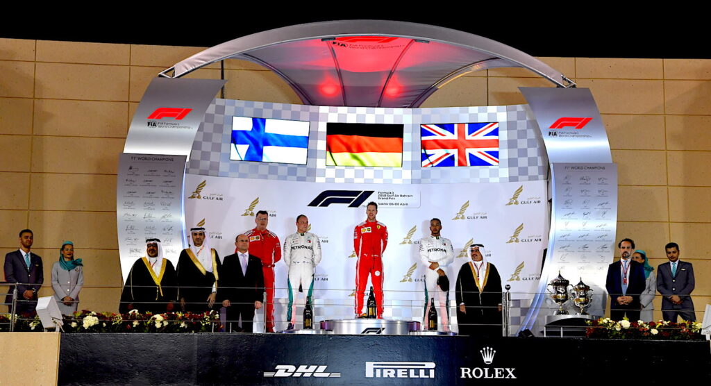 8 أبريل 2018 سمو ولي العهد يتوج فيتيل سائق فيراري بطلاً لسباق جائزة البحرين الكبرى لطيران الخليج للفورمولا واحد 2018