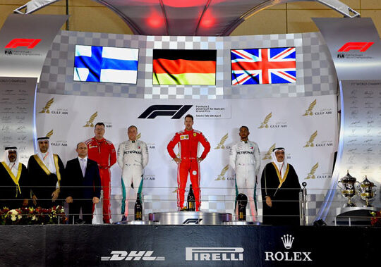 تَوَّج صاحب السمو الملكي الأمير سلمان بن حمد آل خليفة ولي العهد نائب القائد الأعلى النائب الأول لرئيس مجلس الوزراء سيباستيان فيتيل متسابق فريق فيراري سكوديريا الفائز بسباق جائزة البحرين الكبرى لطيران الخليج للفورمولا واحد 2018 في نسخته الرابعة عشر، وفالتيري بوتاس من ميرسيدس ايه ام جي بتروناس، ولويس هاميلتون من ميرسيدس ايه ام جي بتروناس في المركزين الثاني والثالث.