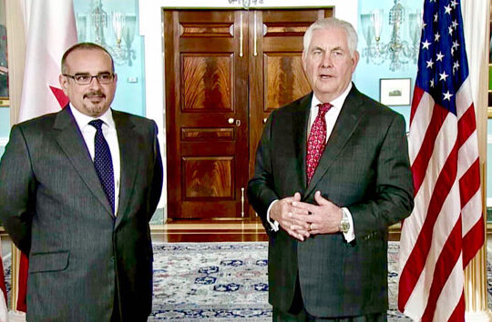 أكد صاحب السمو الملكي الأمير سلمان بن حمد آل خليفة ولي العهد نائب القائد الأعلى النائب الأول لرئيس مجلس الوزراء على تواصل التنسيق والتعاون في إطار العلاقات البحرينية الأمريكية التاريخية التي تحظى بالاهتمام والرعاية من قادة البلدين الصديقين مما يسهم في التعامل مع مختلف قضايا المنطقة ودعم الجهود الإقليمية والدولية التي تهدف إلى ترسيخ الأمن والاستقرار ومحاربة كافة أشكال الإرهاب والتطرف.