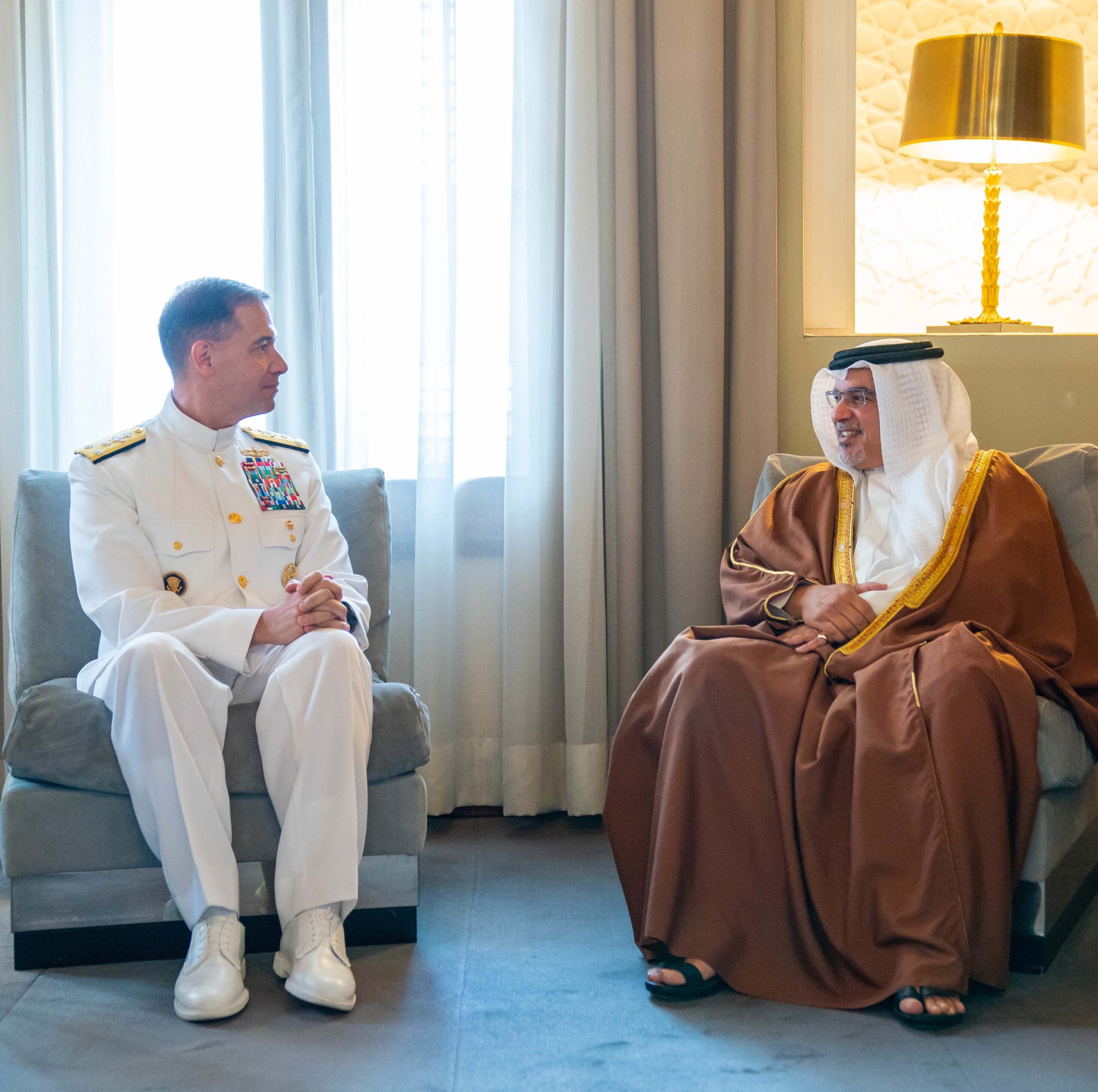جاء ذلك لدى لقاء سموه حفظه الله بقصر الرفاع اليوم، بحضور سعادة السيد حمد بن فيصل المالكي وزير شؤون مجلس الوزراء، الفريق بحري تشارلز برادفورد كوبر قائد القوات البحرية بالقيادة المركزية الأمريكية قائد الأسطول الخامس، حيث رحب سموه بقائد القوات البحرية بالقيادة المركزية الأمريكية قائد الأسطول الخامس، وأشاد سموه بالتقدم المستمر الذي يشهده التعاون الثنائي بين البلدين الصديقين، منوهاً بجهود الولايات المتحدة الأمريكية إلى جانب الدول الشقيقة والصديقة في تعزز أمن واستقرار المنطقة.