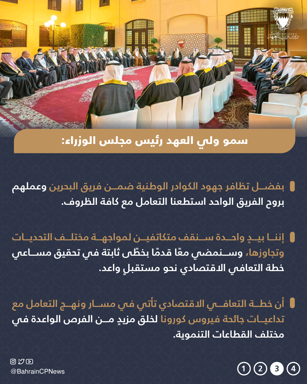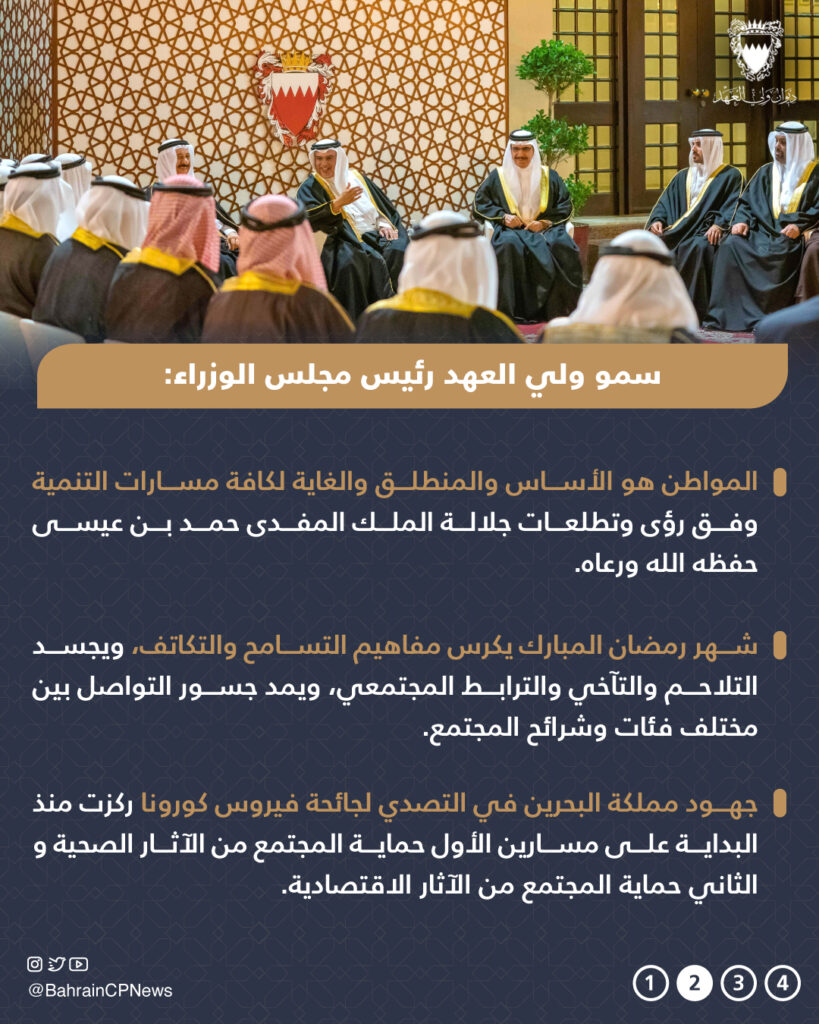 وقال سموه إن القيم البحرينية الجامعة الأصيلة بجانب حفظ حرية الحركة والتنقل والشفافية والمشاركة المجتمعية أحد عوامل النجاح في التصدي لجائحة فيروس كورونا، فضلًا عن تظافر جهود الكوادر الوطنية ضمن فريق البحرين وعملهم بروح الفريق الواحد حيث استطعنا التعامل مع كافة الظروف، وإننا بيدٍ واحدة سنقف متكاتفين لمواجهة مختلف التحديات وتجاوزها، وسنمضي معًا قدمًا بخطًى ثابتة في تحقيق مساعي خطة التعافي الاقتصادي نحو مستقبلٍ واعد.