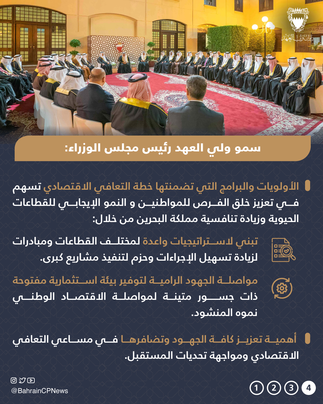 وِأشار سموه إلى أن خطة التعافي الاقتصادي تأتي في مسار ونهج التعامل مع تداعيات جائحة فيروس كورونا لخلق مزيدٍ من الفرص الواعدة في مختلف القطاعات التنموية، لافتاً إلى أن الأولويات والبرامج التي تضمنتها تسهم في تعزيز خلق الفرص للمواطنين و النمو الإيجابي للقطاعات الحيوية وزيادة تنافسية مملكة البحرين من خلال تبنى لاستراتيجيات واعدة لمختلف القطاعات و مبادرات لزيادة تسهيل الإجراءات و حزم لتنفيذ لمشاريع كبرى، ومواصلة الجهود الرامية لتوفير بيئة استثمارية مفتوحة ذات جسور متينة لمواصلة الاقتصاد الوطني نموه المنشود. منوهاً سموه بأهمية تعزيز كافة الجهود وتضافرها في مساعي التعافي الاقتصادي ومواجهة تحديات المستقبل.