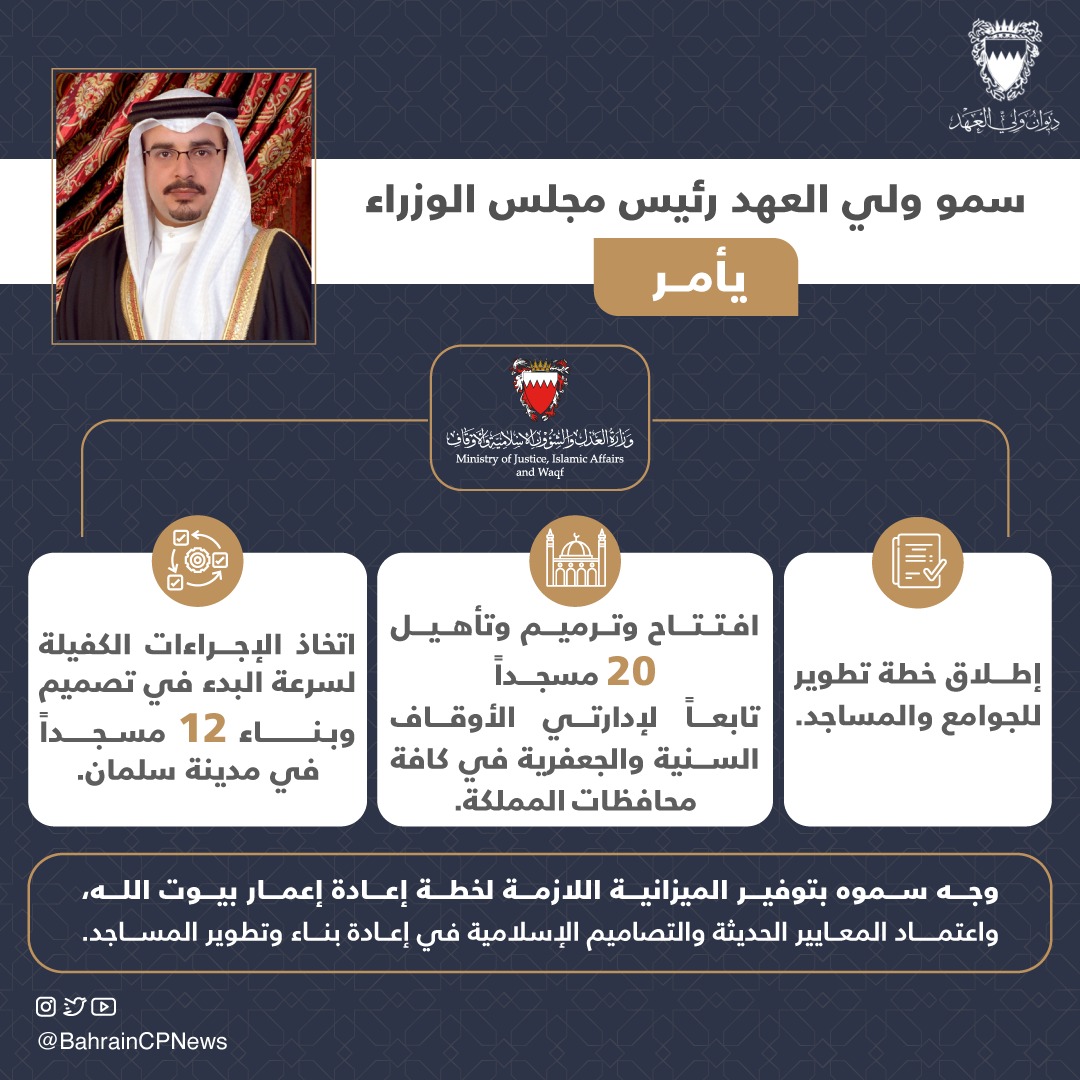 أمر صاحب السمو الملكي الأمير سلمان بن حمد آل خليفة ولي العهد رئيس مجلس الوزراء حفظه الله بإطلاق خطة تطوير للجوامع والمساجد في كافة محافظات مملكة البحرين، والبدء بها فوراً.