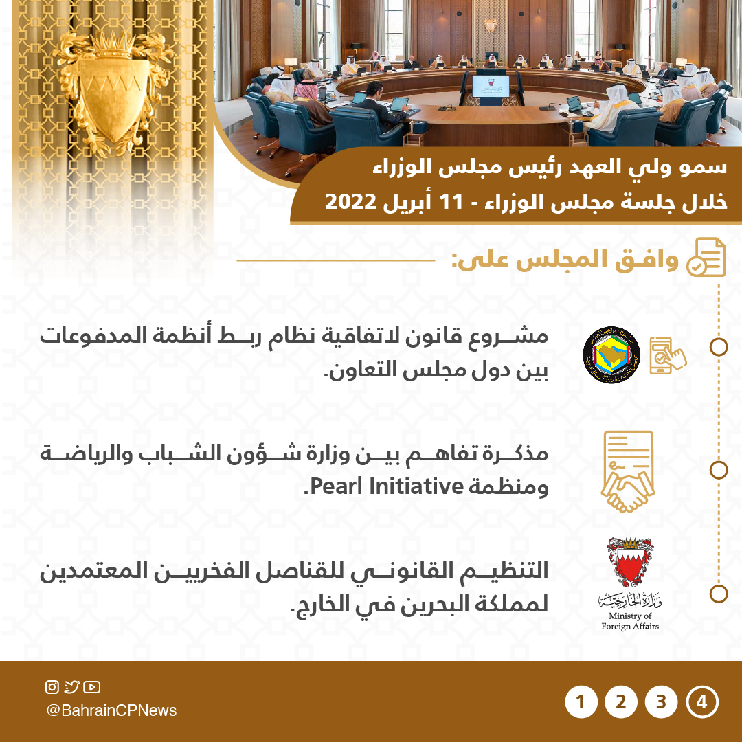 رأس صاحب السمو الملكي الأمير سلمان بن حمد آل خليفة، ولي العهد رئيس مجلس الوزراء، الاجتماع الاعتيادي الأسبوعي لمجلس الوزراء الذي عقد اليوم، بقصر القضيبية.