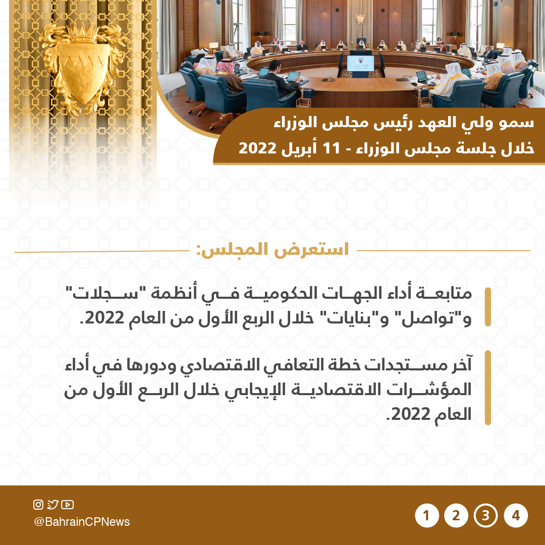 1.مذكرة اللجنة التنسيقية بشأن متابعة أداء الجهات الحكومية في أنظمة “سجلات” و”تواصل” و”بنايات” خلال الربع الأول من العام 2022 بما يسهم في تحقيق مستويات أعلى من الكفاءة والإنتاجية وتعزيز جودة الخدمة الحكومية المقدمة للمواطنين ودعم النشاط التجاري والاستثماري في مملكة البحرين.