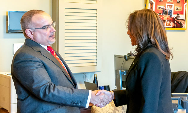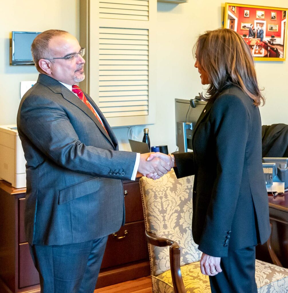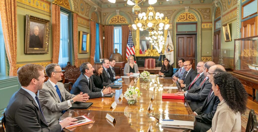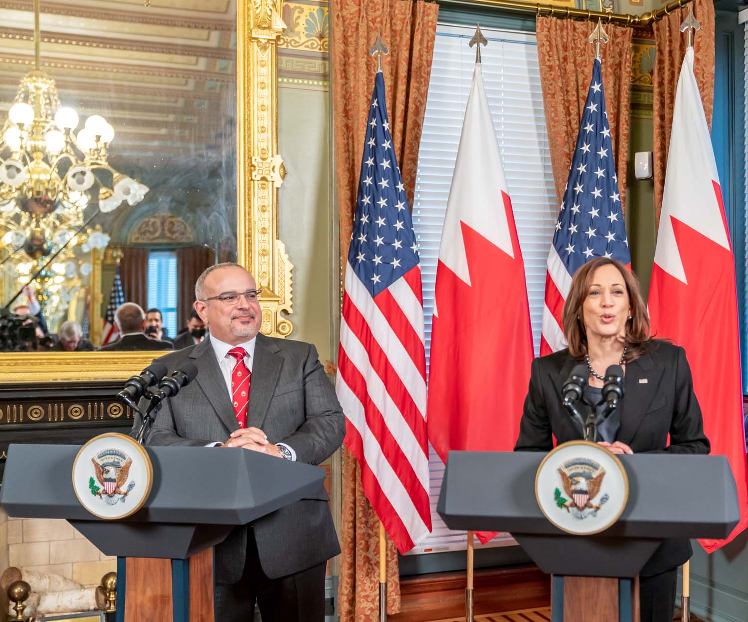 من جانبها، أعربت معالي السيدة كامالا هاريس نائبة رئيس الولايات المتحدة الأمريكية عن سعادتها بلقاء صاحب السمو الملكي الأمير سلمان بن حمد آل خليفة ولي العهد رئيس مجلس الوزراء حفظه الله، مضيفةً أن العلاقات الثنائية بين الولايات المتحدة الأمريكية ومملكة البحرين كانت ومازالت علاقات وثيقة وهامة، وأن الولايات المتحدة تثمن هذه العلاقة وأن مملكة البحرين شريك أمني ومقر للأسطول الخامس وقيادة القوات البحرية المشتركة، وهي كذلك حليف وشريك استراتيجي رئيسي خارج حلف الناتو، لافتةً أن الولايات المتحدة تقدر قوة هذه العلاقة؛ كما ثمنت نائبة الرئيس الأمريكي ما قدمته مملكة البحرين من دعمٍ استراتيجي العام الماضي في جهود الإغاثة وعمليات الإجلاء من أفغانستان.