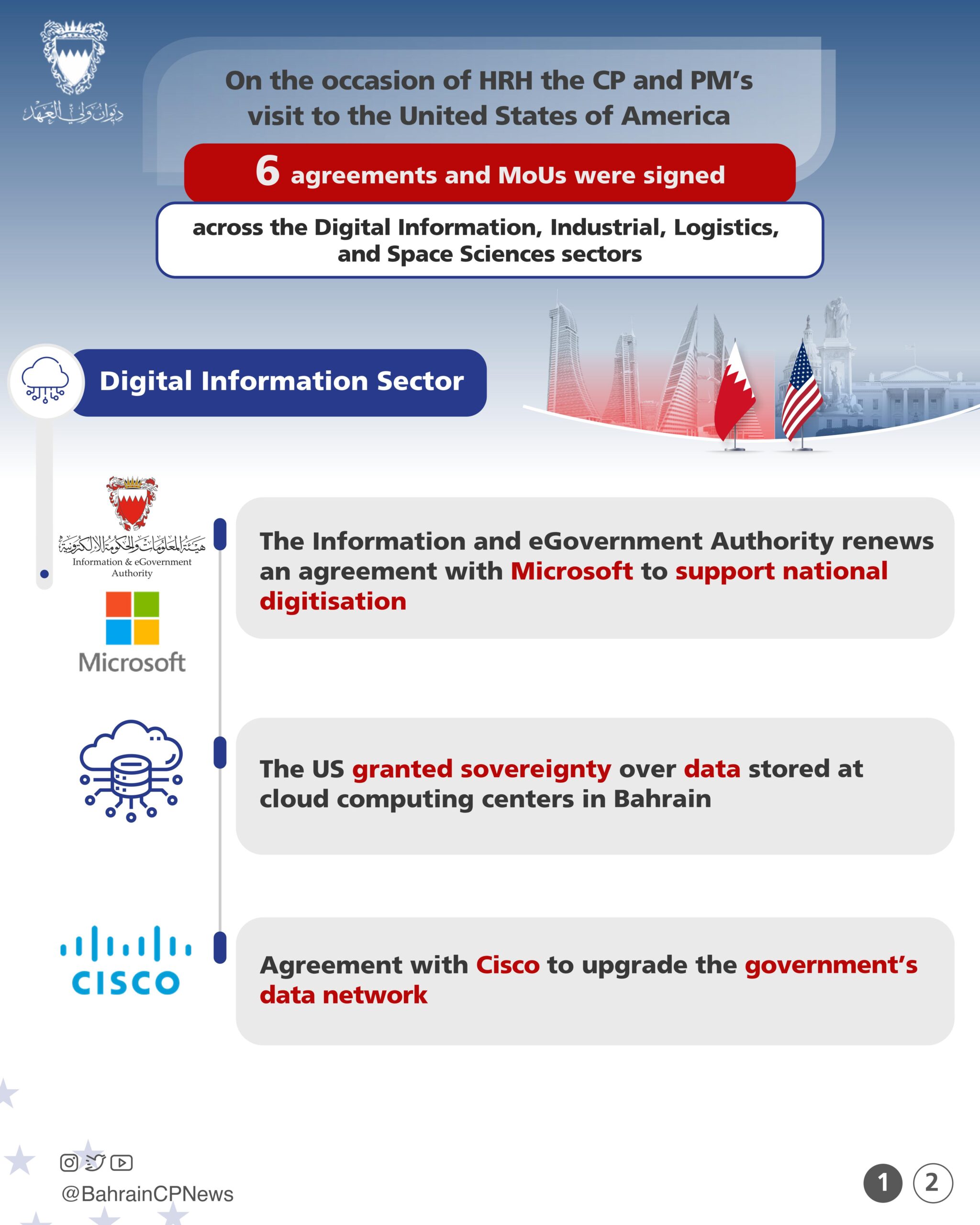 أكد صاحب السمو الملكي الأمير سلمان بن حمد آل خليفة ولي العهد رئيس مجلس الوزراء أن العلاقات التاريخية الاستراتيجية التي تجمع مملكة البحرين والولايات المتحدة الأمريكية الصديقة تواصل نموها على كافة الأصعدة بما يسهم في تحقيق المصالح المشتركة ويعود بالنفع على البلدين والشعبين الصديقين، في ظل ما تحظى به العلاقات الثنائية من اهتمامٍ ورعاية من حضرة صاحب الجلالة الملك حمد بن عيسى آل خليفة عاهل البلاد المفدى حفظه الله ورعاه.