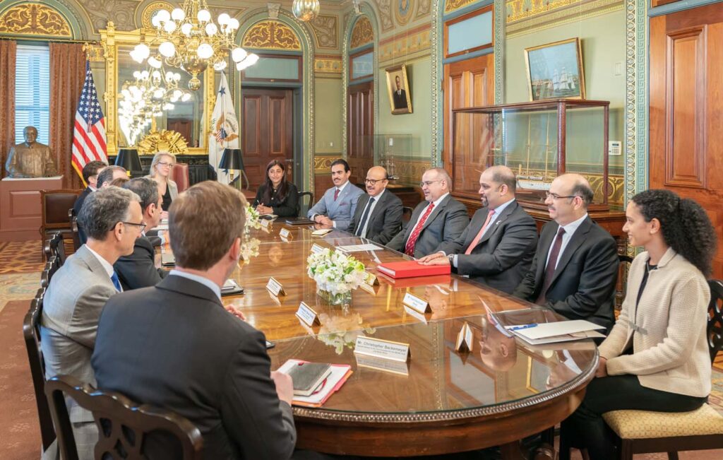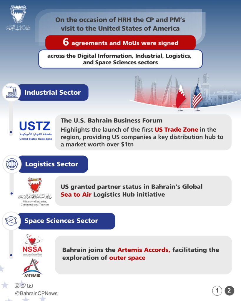 وأشار سموه حفظه الله إلى أن مملكة البحرين تملك تاريخًا عميقًا من التعاون الوثيق مع الولايات المتحدة الأمريكية عززته اتفاقية التجارة الحرة إلى جانب مختلف الاتفاقيات الثنائية على مر العقود والتي انعكست إيجابًا على مستويات التبادل التجاري بين الجانبين بما يعود أثره على رفد القطاعات الاقتصادية تحقيقًا للأهداف المنشودة، لافتاً إلى ما تتسم به العلاقات البحرينية الأمريكية من تنسيق مشترك متواصل كان له الأثر في الدفع بعجلة التعاون نحو مستويات طموحة أثمرت مؤخرًا عن تدشين منطقة التجارة الأمريكية في مملكة البحرين والتي تأتي في إطار حزمة من المشاريع الاستثمارية والاستراتيجية الهادفة إلى خلق المزيد من الفرص النوعية وتعزيز مختلف مسارات النمو الاقتصادي وفق التطلعات المشتركة.