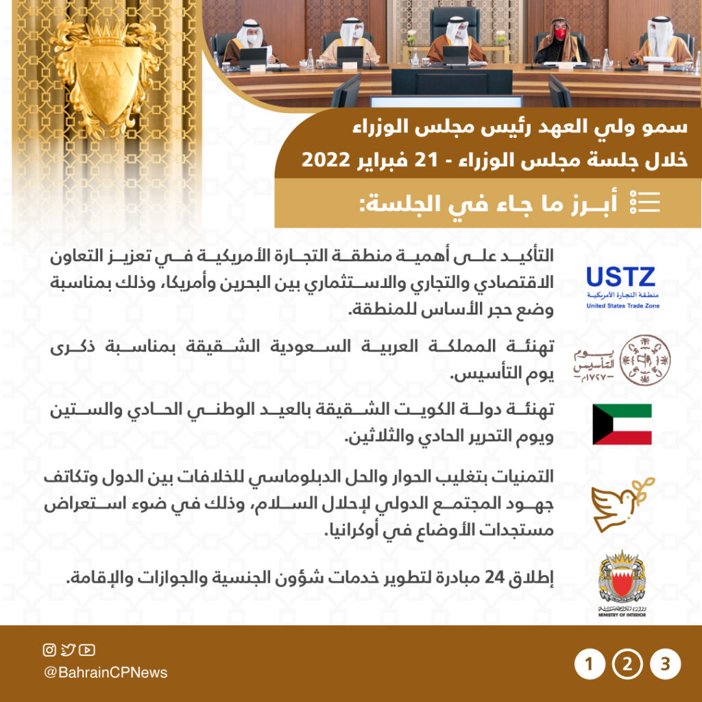 في بداية الاجتماع، أكد المجلس على أهمية منطقة التجارة الأمريكية في الدفع بمسارات التعاون الاقتصادي والتجاري والاستثماري بين مملكة البحرين والولايات المتحدة الأمريكية إلى آفاق أرحب وتعزيز التجارة البينية بين البلدين، وذلك في معرض ترحيب المجلس بوضع حجر الأساس لمنطقة التجارة الأمريكية والتي تأتي في إطار حزمة المشاريع الاستثمارية والاستراتيجية التي تم الإعلان عنها في استراتيجية قطاع الصناعة (2022-2026)، ضمن خطة التعافي الاقتصادي.