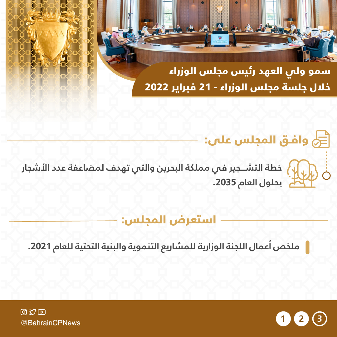 1.مذكرة اللجنة التنسيقية بشأن خطة التشجير في مملكة البحرين، والتي تهدف لمضاعفة عدد الأشجار بحلول العام 2035 ، مع زيادة أشجار القرم بمعدل أربع مرات بحسب أهداف اتفاقية الأمم المتحدة الإطارية بشأن تغير المناخ (cop26) ، كما تتضمن الخطة عدد من المبادرات، منها زيادة الأشجار في المشاريع الحكومية وتشجيع الشراكة المجتمعية لزيادة الرقعة الخضراء وتوفير السياسات الداعمة للتشجير وتشجيع الأفراد على المشاركة في التشجير.