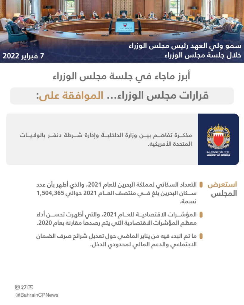 1. مذكرة معالي وزير الداخلية حول التعداد السكاني لمملكة البحرين للعام 2021، والتي أظهرت بأن عدد سكان البحرين بلغ في منتصف العام 2021 حوالي 1,504,365 نسمة.