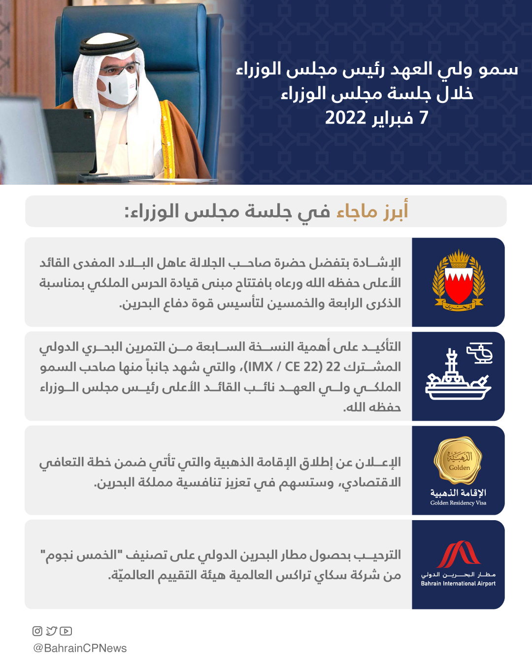 ثم أكد مجلس الوزراء على أهمية النسخة السابعة من التمرين البحري الدولي المشترك 22 (IMX / CE 22 ) ، والتي شهد جانباً منها صاحب السمو الملكي ولي العهد نائب القائد الأعلى رئيس مجلس الوزراء حفظه الله ، منوهاً المجلس بدور مثل هذه التمارين المشتركة في تعزيز العمل الدولي المشترك لمواجهة التحديات التي تحد من حرية الملاحة والحفاظ على التدفق الحر للتجارة البحرية في المنطقة والعالم، معرباً عن شكره لقوة دفاع البحرين والقيادة المركزية للقوات البحرية الأمريكية والأسطول الخامس الأمريكي والقوات البحرية المشتركة والحلفاء وجميع الدول المشاركة في هذا التمرين البحري الدولي المشترك المهم.