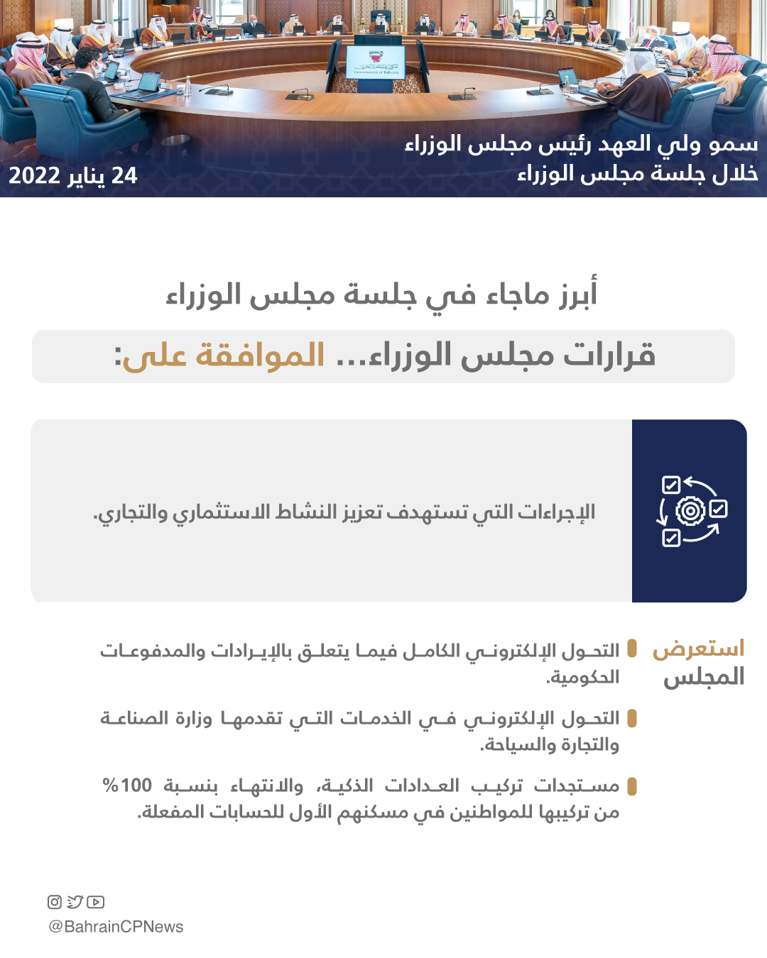 وفي بند التقارير الوزارية، فقد اطلع المجلس على التقارير الوزارية المرفوعة من أصحاب المعالي والسعادة الوزراء، بشأن المواضيع التي تم بحثها خلال اجتماع الوفد الحكومي برئاسة معالي وزير المالية والاقتصاد الوطني مع المسؤولين بجمهورية اليونان، ومتابعة مسار تنفيذ قرارات مجلس الوزراء من يناير 2021 لغاية يناير 2022.