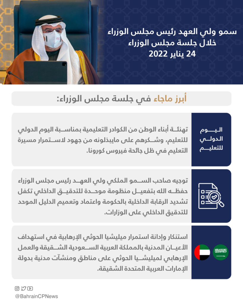 ثم أعرب مجلس الوزراء عن استنكار وإدانة مملكة البحرين لاستمرار ميليشيا الحوثي الإرهابية في استهداف الأعيان المدنية بالمملكة العربية السعودية الشقيقة بشكل متعمد وممنهج، مما يعرض للخطر حياة الأبرياء الآمنين والمنشآت المدنية الحيوية، كما أدان واستنكر العمل الإرهابي لميليشيا الحوثي على مناطق ومنشآت مدنية على الأراضي الإماراتية واستهداف أرواح الأبرياء الآمنين والذي يتنافى مع جميع الأعراف والقوانين الدولية والقيم الإنسانية، ويعد انتهاك صارخ للقانون الدولي الإنساني، وفيما أعرب المجلس عن تعازيه لأسر الضحايا وتمنياته بالشفاء للمصابين، فقد جدد موقف مملكة البحرين الداعم للمملكة العربية السعودية الشقيقة ودولة الإمارات العربية المتحدة الشقيقة في تصديهما لهذه الاعتداءات الإرهابية الخطيرة وما يتخذانه من إجراءات لحفظ أمنهما واستقرارهما، مرحبا المجلس في هذا الصدد بالبيان الذي أصدره مجلس الأمن الدولي وجامعة الدول العربية ، وأدان فيه بالإجماع اعتداء ميليشيا الحوثي الإرهابية على دولة الإمارات.
