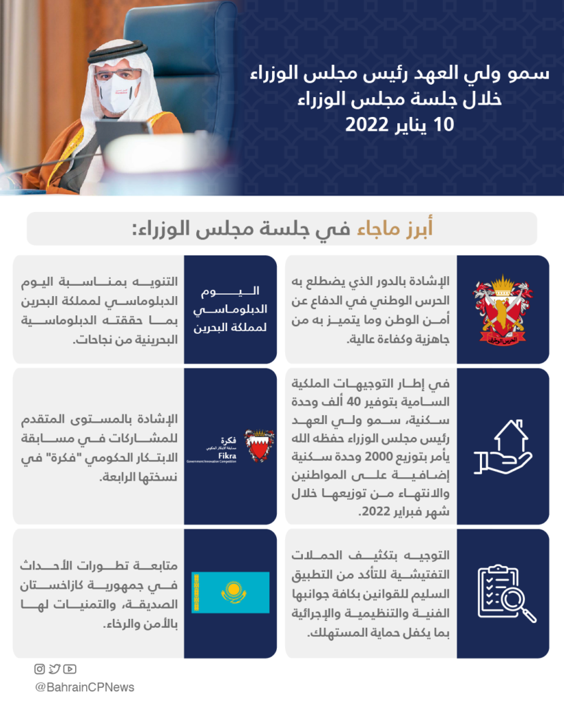 بعدها نوه المجلس بمناسبة اليوم الدبلوماسي لمملكة البحرين الذي يُصادف 14 يناير من كل عام ، بما حققته الدبلوماسية البحرينية خلال مسيرتها الممتدة لأكثر من 50 عاماً من نجاحات عززت مكانة المملكة إقليمياً ودولياً، مؤكداً مواصلة مملكة البحرين في تطوير علاقاتها مع دول العالم وإقامة الشراكات التي تحقق تطلعات الجميع في الأمن والتنمية.