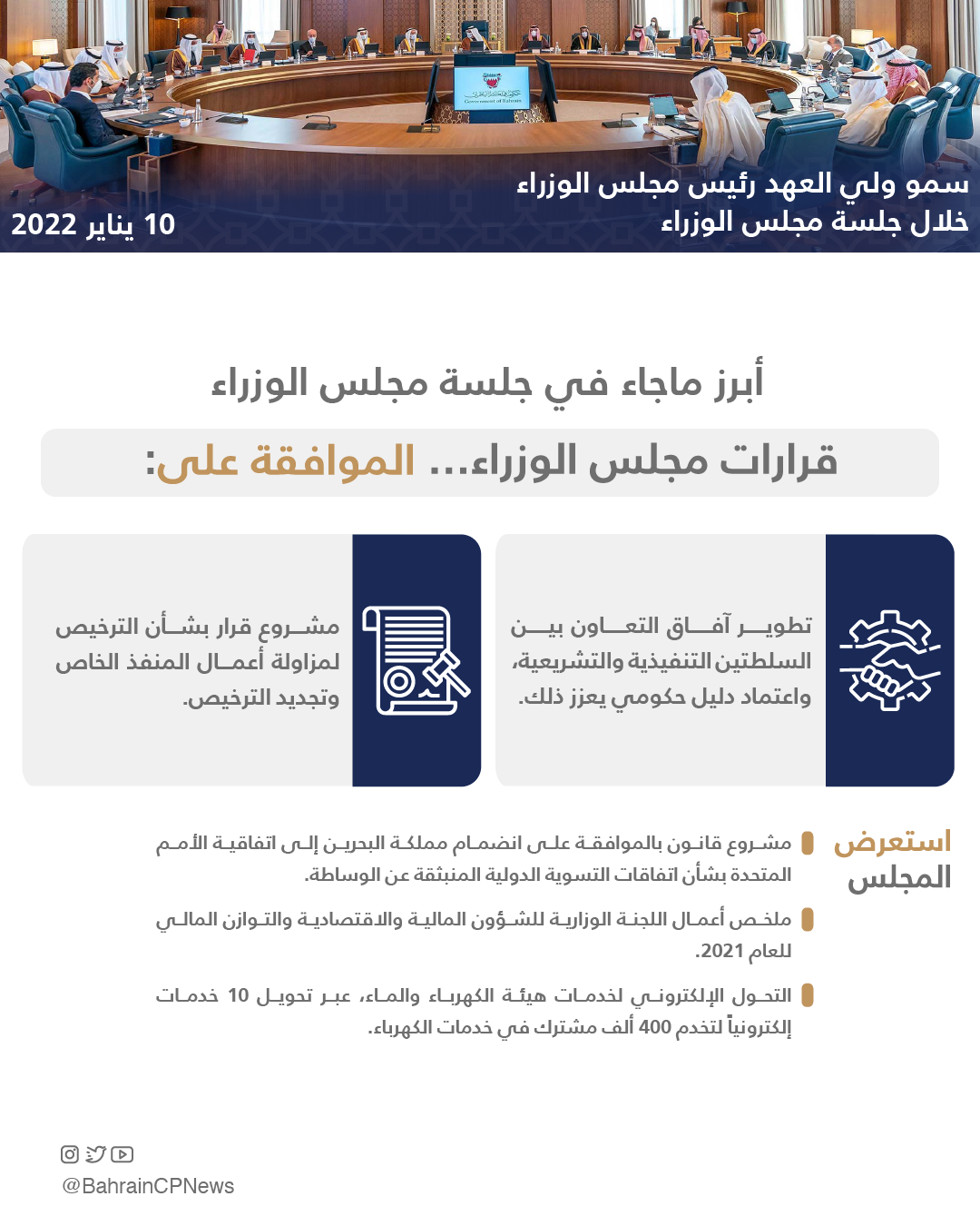 رأس صاحب السمو الملكي الأمير سلمان بن حمد آل خليفة، ولي العهد رئيس مجلس الوزراء، الاجتماع الاعتيادي الأسبوعي لمجلس الوزراء الذي عقد اليوم، بقصر القضيبية.