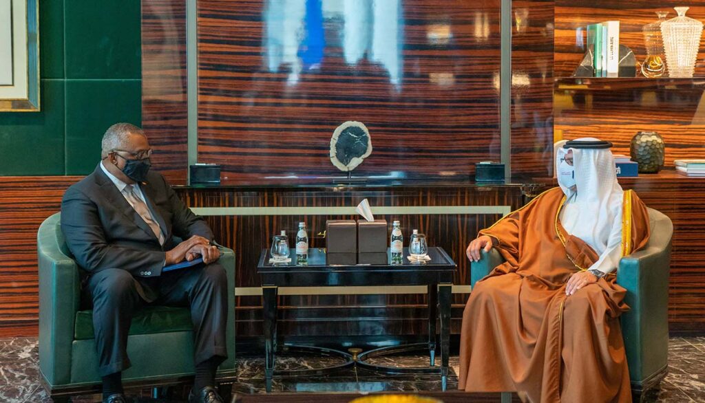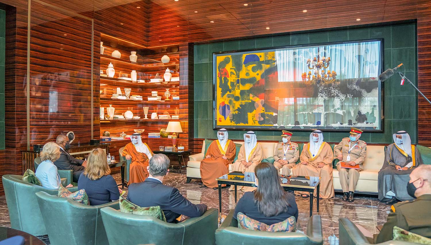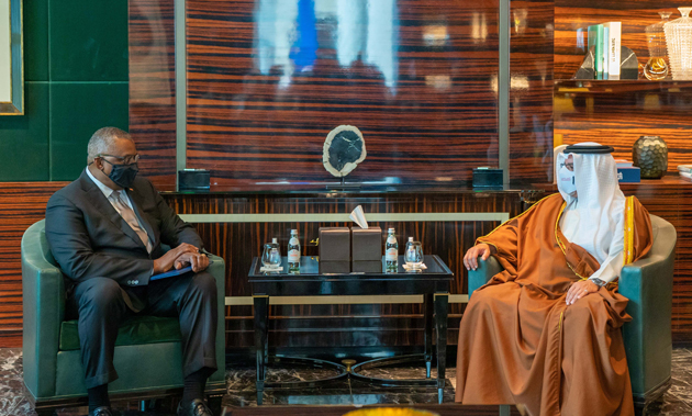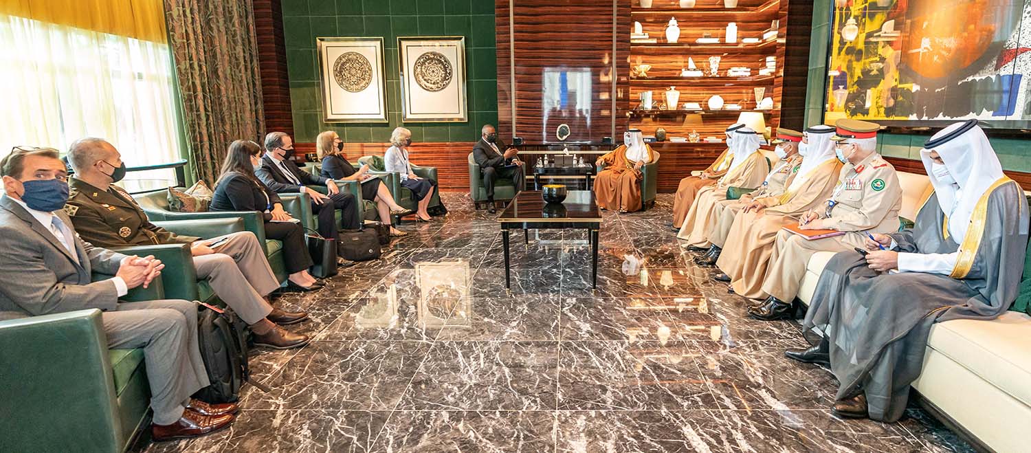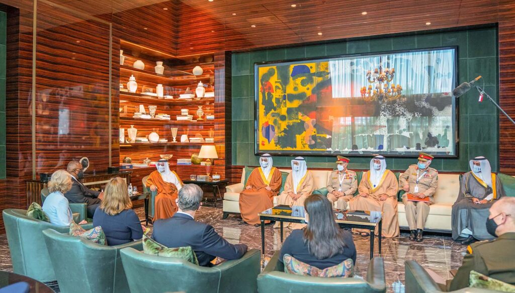 جاء ذلك لدى لقاء سموه حفظه الله اليوم سعادة السيد لويد أوستون وزير الدفاع بالولايات المتحدة الأمريكية الصديقة والوفد المرافق، بحضور معالي الشيخ سلمان بن خليفة آل خليفة وزير المالية والاقتصاد الوطني، وسعادة الفريق الركن عبدالله بن حسن النعيمي وزير شؤون الدفاع، وسعادة الفريق الركن ذياب بن صقر النعيمي رئيس هيئة الأركان، وذلك في إطار انعقاد أعمال منتدى حوار المنامة 2021، حيث رحب سموه بالضيف والوفد المرافق، منوهاً سموه بالعلاقات الاستراتيجية والتاريخية بين البلدين الصديقين.