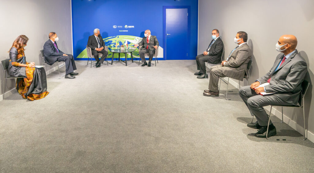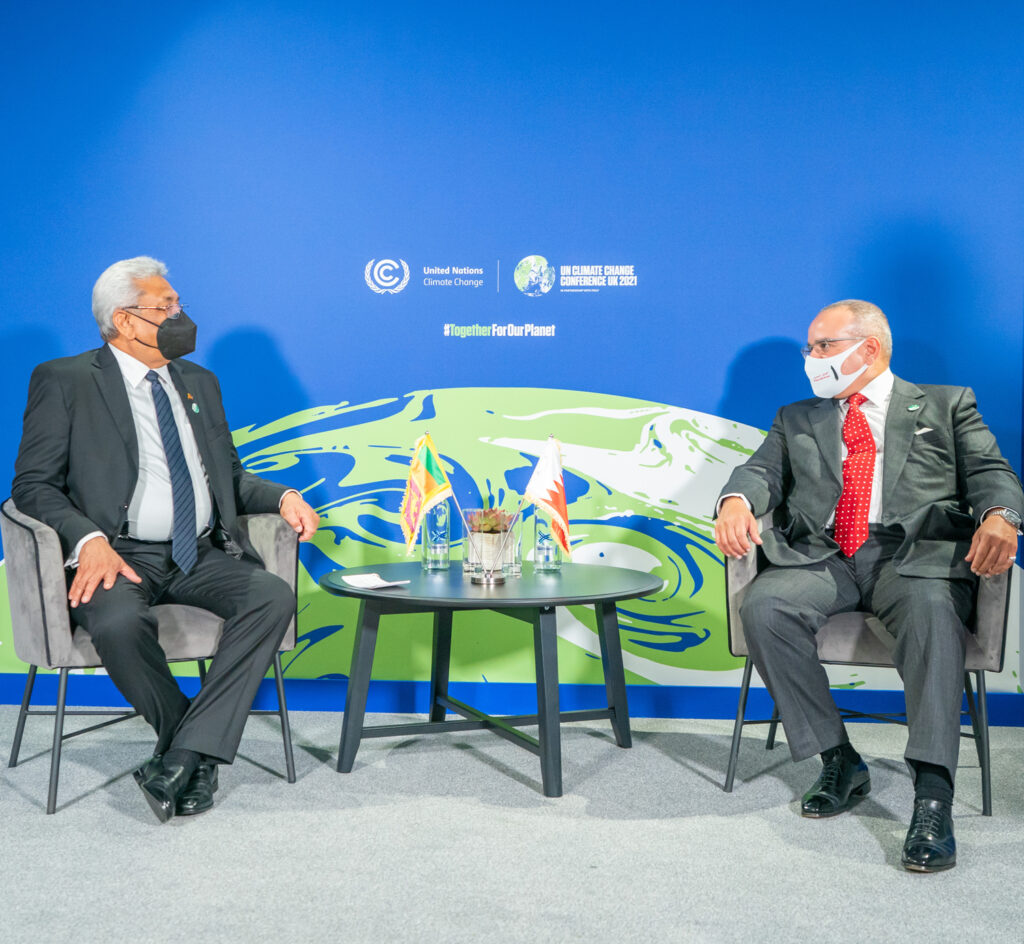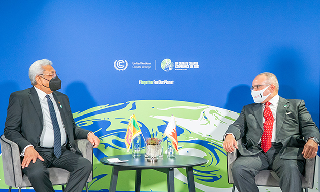 جاء ذلك لدى لقاء سموه، حفظه الله، اليوم فخامة الرئيس غوتابايا راجاباكسا، رئيس جمهورية سريلانكا الديمقراطية الاشتراكية، وذلك في إطار مشاركة سموه في مؤتمر الأمم المتحدة السادس والعشرين للتغير المناخي 2021، بحضور معالي الشيخ فواز بن محمد آل خليفة، سفير مملكة البحرين لدى المملكة المتحدة الصديقة، وسعادة الدكتور محمد بن مبارك بن دينه، المبعوث الخاص لشؤون المناخ الرئيس التنفيذي للمجلس الأعلى للبيئة، حيث نوه سموه بما يجمع البلدين الصديقين من تعاون في المجالات المختلفة وأهمية مواصلة العمل على تنميته بما يسهم في توسيع آفاق التعاون المشترك على كافة الأصعدة.