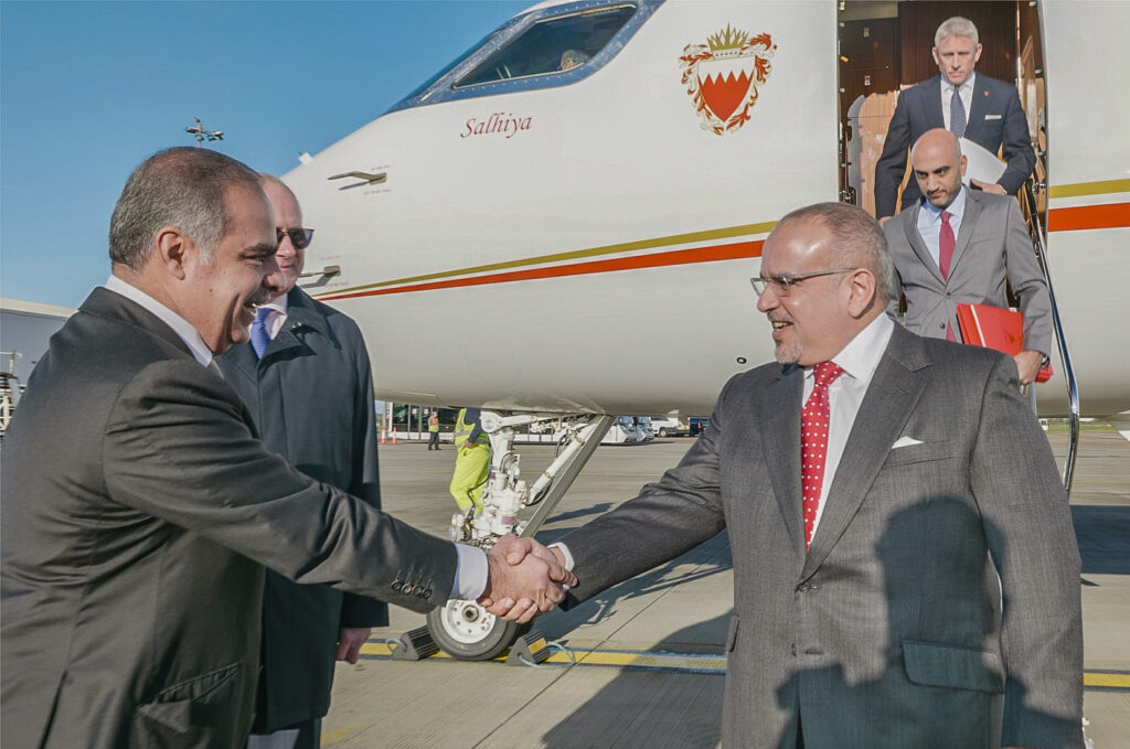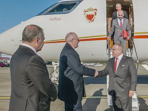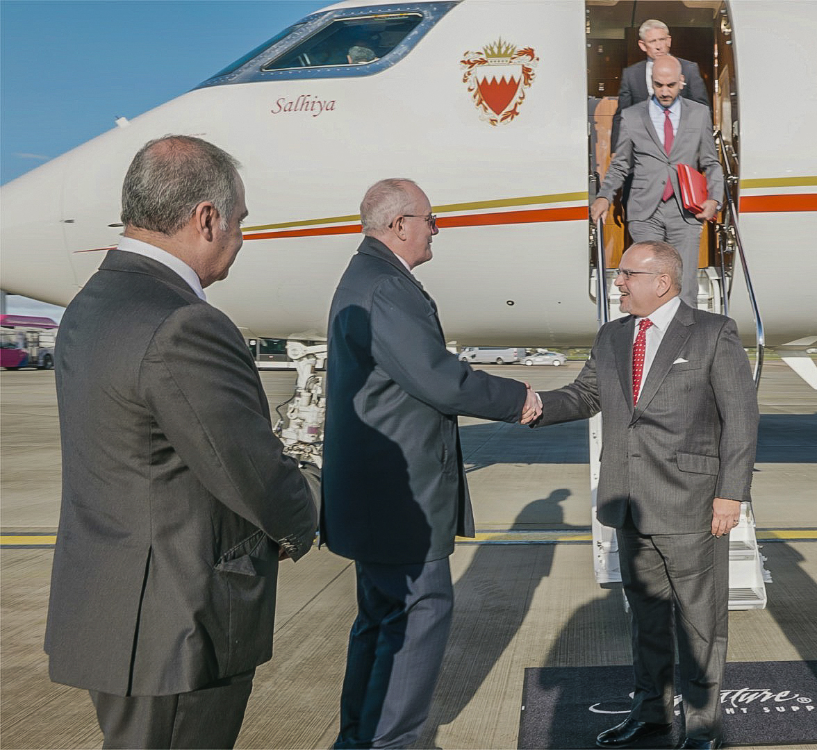وكان في مقدمة مستقبلي صاحب السمو الملكي ولي العهد رئيس مجلس الوزراء حفظه الله السيد ريتشارد أوزموند ممثل ملكة بريطانيا سفير بوزارة الخارجية والكومنولث والتنمية البريطانية، ومعالي الشيخ فواز بن محمد آل خليفة سفير مملكة البحرين لدى المملكة المتحدة الصديقة.