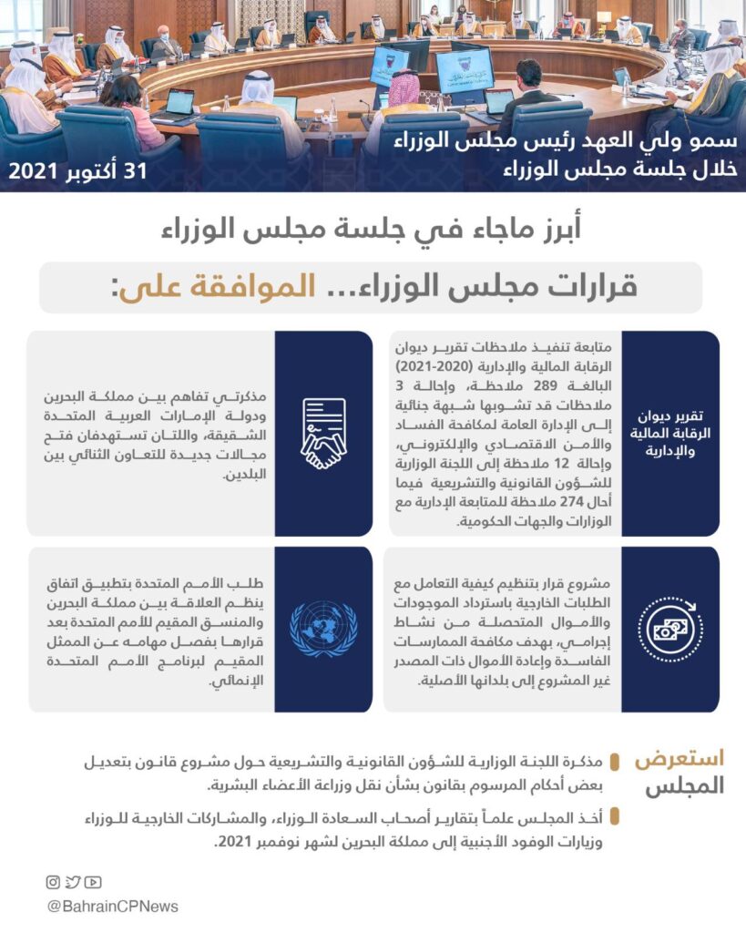 في بداية الاجتماع، أشاد مجلس الوزراء بنتائج الزيارة التي قام بها حضرة صاحب الجلالة الملك حمد بن عيسى آل خليفة عاهل البلاد المفدى حفظه الله ورعاه إلى دولة الإمارات العربية المتحدة الشقيقة وبأهمية لقاءات جلالته مع أخيه صاحب السمو الشيخ محمد بن راشد آل مكتوم نائب رئيس دولة الإمارات العربية المتحدة الشقيقة، رئيس مجلس الوزراء حاكم دبي وأخيه صاحب السمو الشيخ محمد بن زايد آل نهيان ولي عهد أبوظبي نائب القائد الأعلى للقوات المسلحة بدولة الإمارات العربية المتحدة الشقيقة في دعم وتعزيز العلاقات الأخوية الراسخة بين البلدين وشعبيهما الشقيقين ، منوهاً المجلس بما وصل إليه التنسيق والتكامل بين البلدين الشقيقين من مستويات متقدمة تعكس متانة العلاقات البحرينية -الإماراتية.