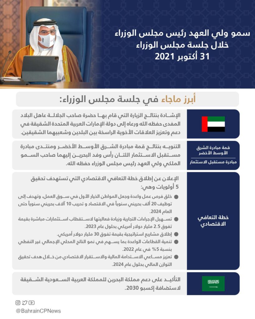 ثم نوه مجلس الوزراء بنتائج قمة مبادرة الشرق الأوسط الأخضر ومنتدى مبادرة مستقبل الاستثمار اللتان رأس وفد البحرين إليهما صاحب السمو الملكي ولي العهد رئيس مجلس الوزراء حفظه الله، مشيداً المجلس بدور المملكة العربية السعودية الشقيقة بقيادة خادم الحرمين الشريفين الملك سلمان بن عبدالعزيز آل سعود عاهل المملكة العربية السعودية وبدعم صاحب السمو الملكي الأمير محمد بن سلمان بن عبدالعزيز آل سعود ولي العهد نائب رئيس مجلس الوزراء وزير الدفاع في تبني المبادرات التي توحد الجهود الدولية حول الأهداف التي تنمي مسارات الاستثمار العالمي وتكفل الحفاظ على الأمن البيئي.