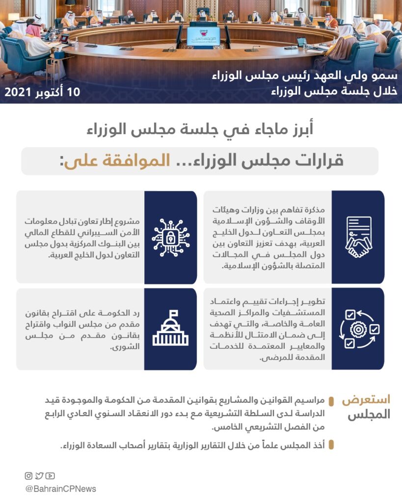 ثم أخذ المجلس علماً من خلال التقارير الوزارية لأصحاب السعادة الوزراء بشأن المشاركة في الدورة العادية 65 للمؤتمر العام للوكالة الدولية للطاقة الذرية، وزيارة وزيرة الخارجية والتعاون الدولي بدولة ليبيا الشقيقة إلى مملكة البحرين.