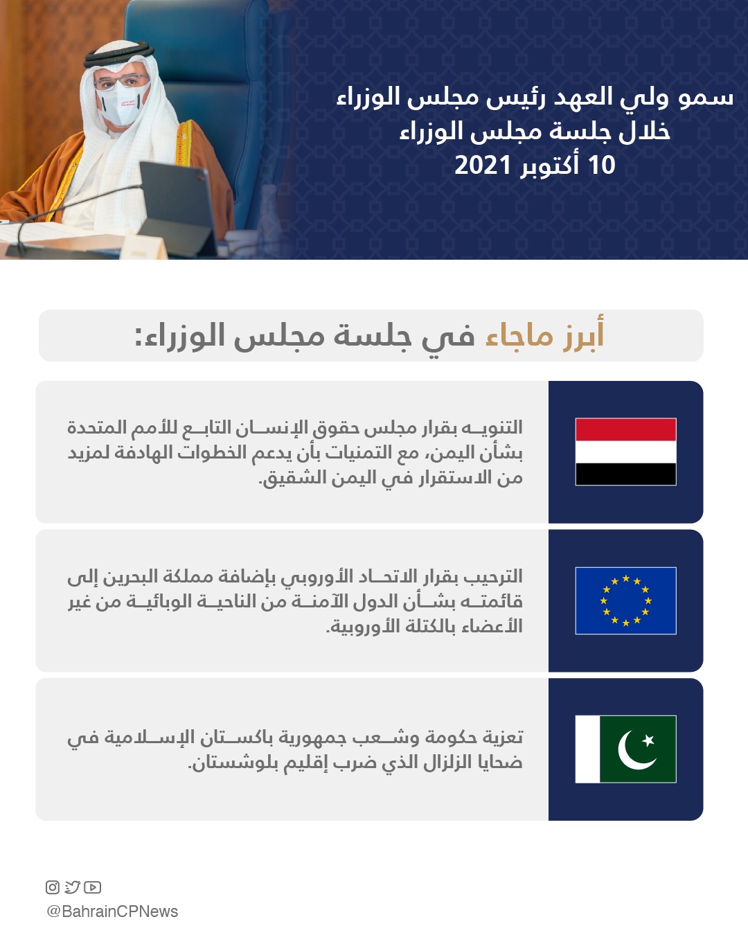 بعدها رحب المجلس بقرار الاتحاد الأوروبي بإضافة مملكة البحرين إلى قائمته بشأن الدول الآمنة من الناحية الوبائية من غير الأعضاء بالكتلة الأوروبية، مؤكداً أن ذلك يعكس النتائج التي تحققت للمملكة بفضل الجهود الوطنية على كافة مسارات التعامل مع جائحة فيروس كورونا(كوفيد-19).