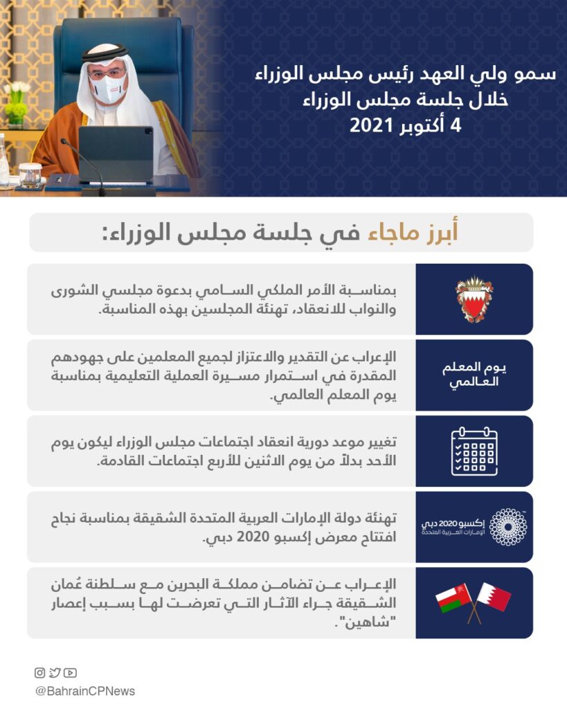 و في بداية الاجتماع، وبمناسبة الأمر الملكي السامي لحضرة صاحب الجلالة الملك حمد بن عيسى آل خليفة عاهل البلاد المفدى حفظه الله ورعاه رقم (35) لسنة 2021 بدعوة مجلسي الشورى والنواب للانعقاد، فقد هنأ مجلس الوزراء مجلسي النواب والشورى بهذه المناسبة، معرباً عن تطلعه لتعزيز التعاون الثنائي بين السلطتين ومواصلة التنسيق والشراكة بما يعود بالنماء على الوطن والخير للمواطنين، وتحقيق الأهداف المرجوة.