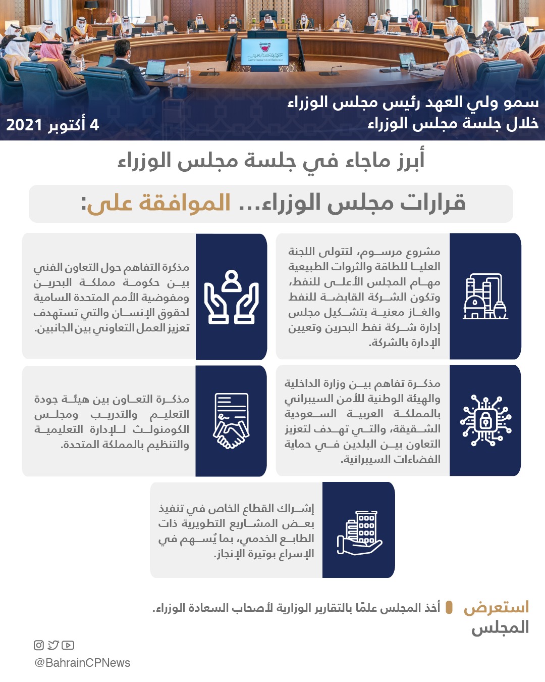 ثم أخذ المجلس علما من خلال التقارير الوزارية لأصحاب السعادة الوزراء، بالمشاركة في أعمال الدورة 76 للجمعية العامة للأمم المتحدة، ونتائج زيارة سلطنة عُمان، والمشاركة في الدورة (149) للمجلس الوزاري لمجلس التعاون لدول الخليج العربية ، بالإضافة إلى نتائج زيارة معالي السيد يائير لابيد وزير خارجية دولة إسرائيل إلى مملكة البحرين، والمشاركة في المنتدى الدولي للاتصال الحكومي بدولة الإمارات العربية المتحدة، والمشاركة في فعاليات حفل افتتاح معرض إكسبو دبي 2020،والمشاركات الخارجية للوزراء وزيارات الوفود الأجنبية إلى مملكة البحرين لشهر أكتوبر 2021.