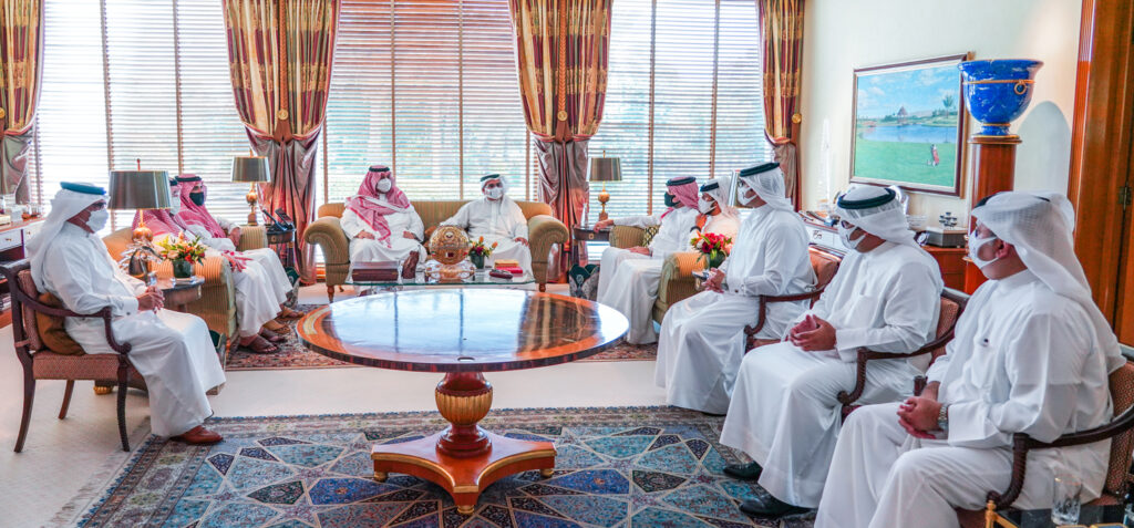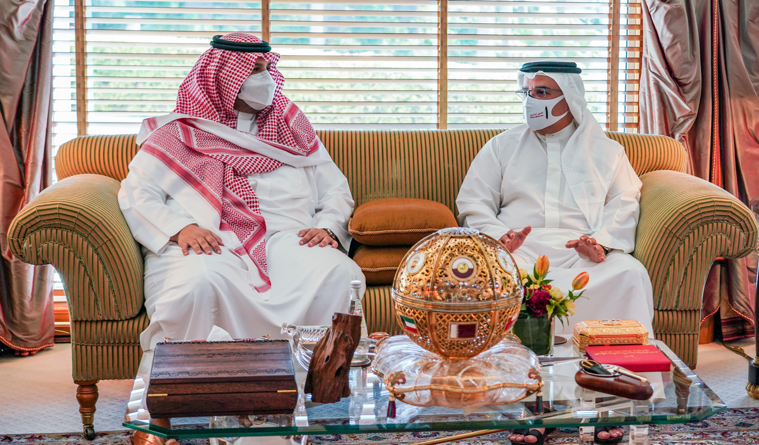 جاء ذلك لدى لقاء سموه حفظه الله بقصر الصافرية اليوم صاحب السمو الملكي الأمير تركي بن محمد بن فهد بن عبدالعزيز آل سعود وزير الدولة عضو مجلس الوزراء بالمملكة العربية السعودية الشقيقة، بحضور سمو الشيخ عبدالله بن حمد آل خليفة الممثل الشخصي لجلالة الملك المفدى رئيس المجلس الأعلى للبيئة، وسمو الشيخ ناصر بن حمد آل خليفة ممثل جلالة الملك للأعمال الإنسانية وشئون الشباب، وسمو الشيخ عيسى بن سلمان بن حمد آل خليفة رئيس الهيئة العليا لنادي راشد للفروسية وسباق الخيل، والفريق أول معالي الشيخ راشد بن عبد الله آل خليفة وزير الداخلية، ومعالي الشيخ سلمان بن خليفة آل خليفة وزير المالية والاقتصاد الوطني، وصاحب السمو الملكي الأمير سلطان بن أحمد بن عبدالعزيز آل سعود سفير المملكة العربية السعودية لدى البحرين، وعدد من كبار المسؤولين، حيث نقل صاحب السمو الملكي الأمير تركي بن محمد بن فهد بن عبدالعزيز آل سعود إلى صاحب السمو الملكي ولي العهد رئيس مجلس الوزراء تحيات خادم الحرمين الشريفين وولي عهده، كما حمّله سموه نقل تحياته لخادم الحرمين الشريفين وولي عهده حفظهما الله.
