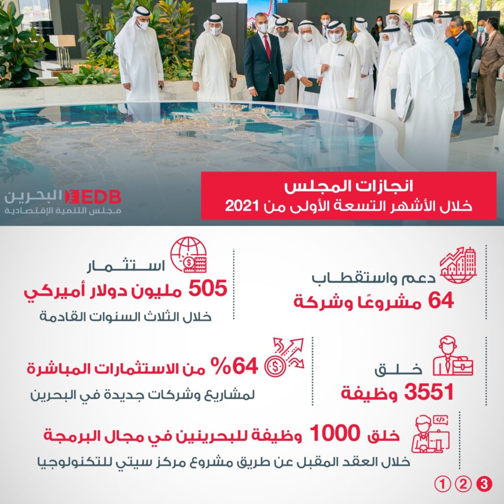 كما وتطرق السيد خالد حميدان خلال عرضه إلى أداء مجلس التنمية الاقتصادية حيث نجح المجلس للفترة من يناير وحتى سبتمبر من العام الجاري، في دعم واستقطاب 64 مشروعًا وشركة من المتوقع أن تستثمر 505 مليون دولار أميركي خلال الثلاث السنوات القادمة وتخلق 3551 وظيفة؛ 64% من هذه الاستثمارات المباشرة هي لمشاريع وشركات جديدة في البحرين وتأتي من مؤسسات مختلفة من ثلاثة عشر دولة وتدخل في جميع القطاعات الاقتصادية.
