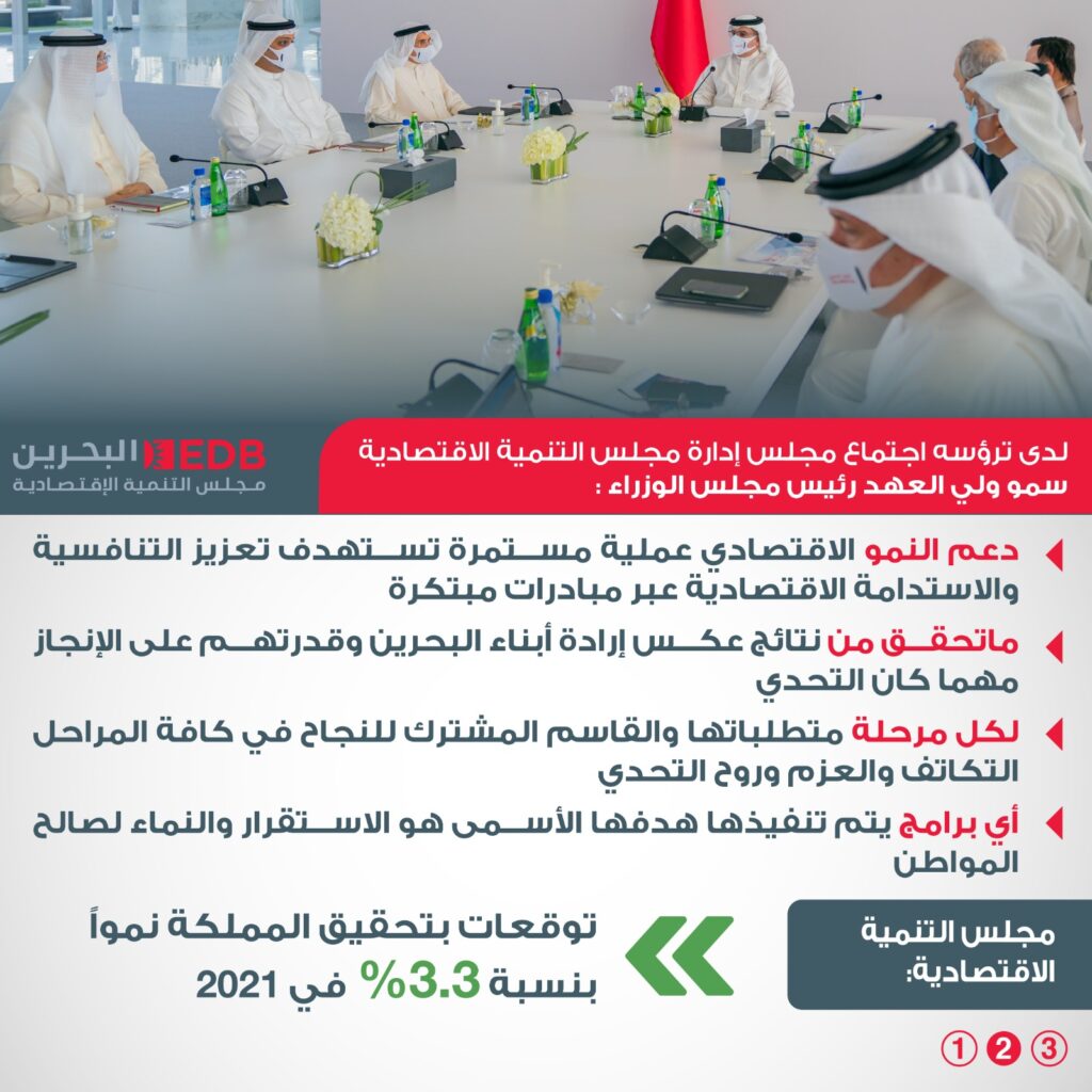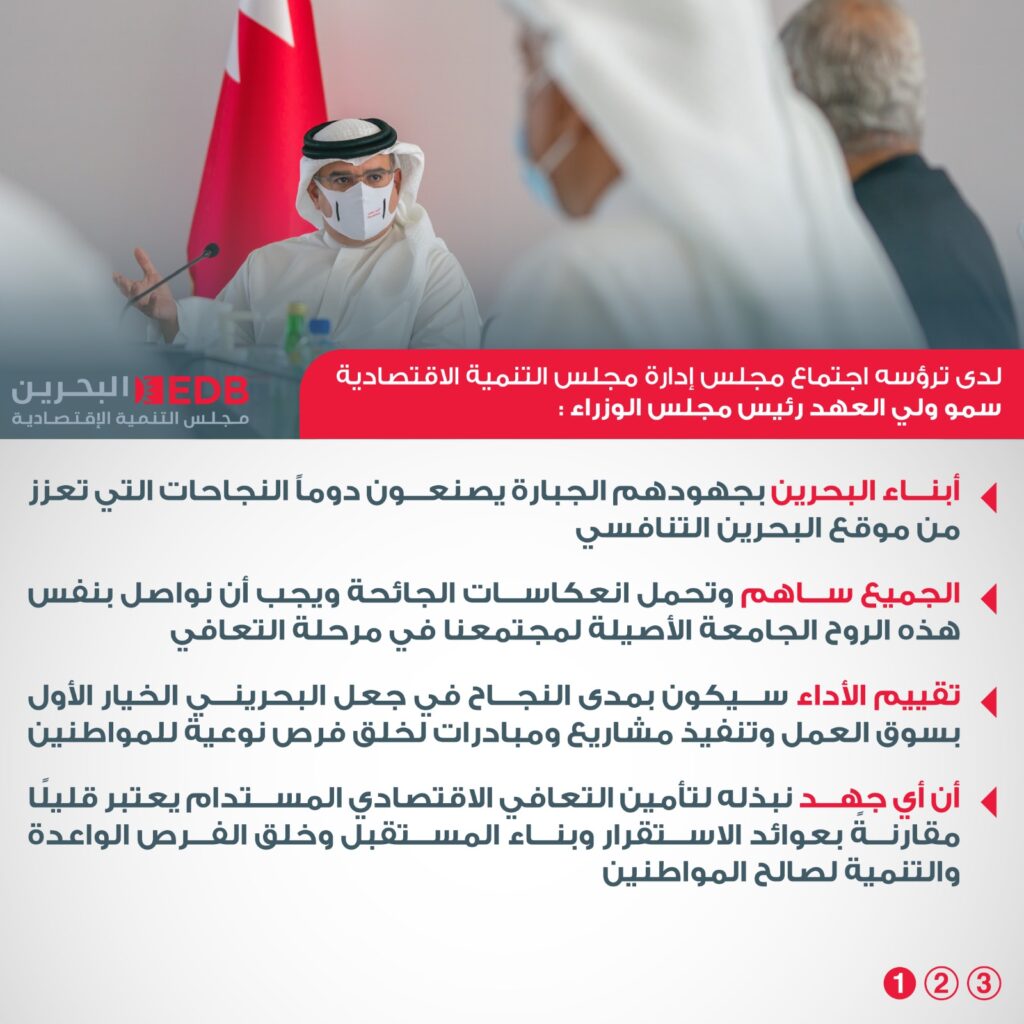 وأعرب صاحب السمو الملكي ولي العهد رئيس مجلس الوزراء رئيس مجلس التنمية الاقتصادية عن الاعتزاز بما تحقق من نتائج طيبة عكست إرادة أبناء البحرين وقدرتهم على الإنجاز مهما كان مدى التحدي، مؤكداً سموه بأن لكل مرحلة متطلباتها ولكن القاسم المشترك للنجاح فيها هو التكاتف والعزم وروح التحدي التي كانت عنوان الجهود الوطنية وجعلت منها قصصاً ملهمة، لافتاً سموه إلى أهمية تعزيز كافة مساعي التعافي الاقتصادي لمواصلة الاقتصاد الوطني نموه المنشود.