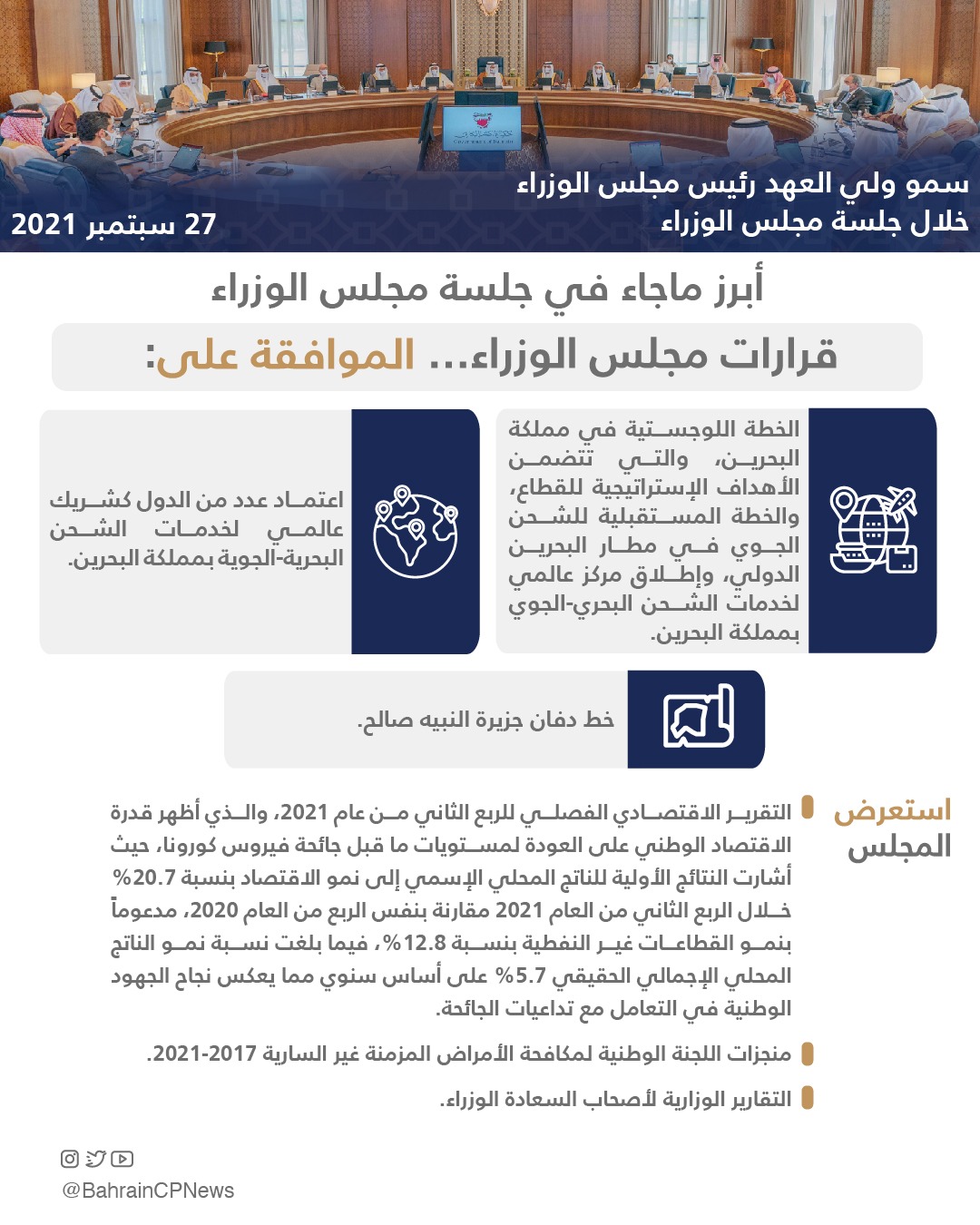 3- أخذ المجلس علماً من خلال التقارير الوزارية لأصحاب السعادة الوزراء بشأن نتائج المشاركة في أعمال الاجتماع السابع للجنة وزراء العمل ولجنة وزراء الشئون الاجتماعية بدول مجلس التعاون لدول الخليج العربية، والتوقيع على اتفاقية تنظيم معرض البحرين الدولي للطيران 2022-2024 والمشاركة في معرض DESI لندن، وترؤس مملكة البحرين أعمال الاجتماع التاسع عشر لأصحاب المعالي والسعادة الوزراء المعنيين بشئون الإسكان بدول مجلس التعاون، والمشاركة في أعمال المنتدى العربي الخامس للمياه.