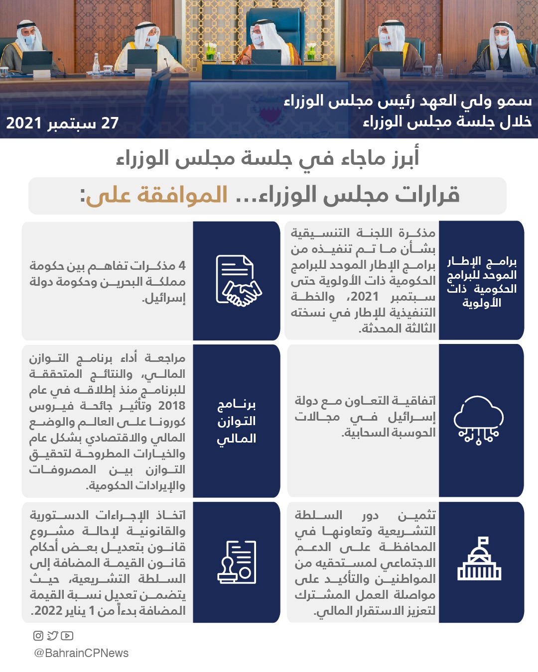 4-مذكرة اللجنة الوزارية للشؤون المالية والاقتصادية والتوازن المالي بشأن مراجعة أداء برنامج التوازن المالي، والتي استعرضت النتائج المتحققة للبرنامج منذ إطلاقه في عام 2018 بهدف تحقيق التوازن بين المصروفات والإيرادات الحكومية، وتأثير جائحة فيروس كورونا على العالم والوضع المالي والاقتصادي بشكل عام، والخيارات المطروحة لتحقيق التوازن بين المصروفات والإيرادات لتحقيق التوازن المالي. وقد ثمن المجلس دور السلطة التشريعية في المحافظة على الدعم الاجتماعي لمستحقيه من المواطنين وأكد على مواصلة العمل المشترك لتعزيز الاستقرار المالي ،كما تمت الموافقة على اتخاذ الإجراءات الدستورية والقانونية لإحالة مشروع قانون بتعديل بعض أحكام قانون القيمة المضافة إلى السلطة التشريعية، حيث يتضمن تعديل نسبة القيمة المضافة بدءاً من 1 يناير 2022.