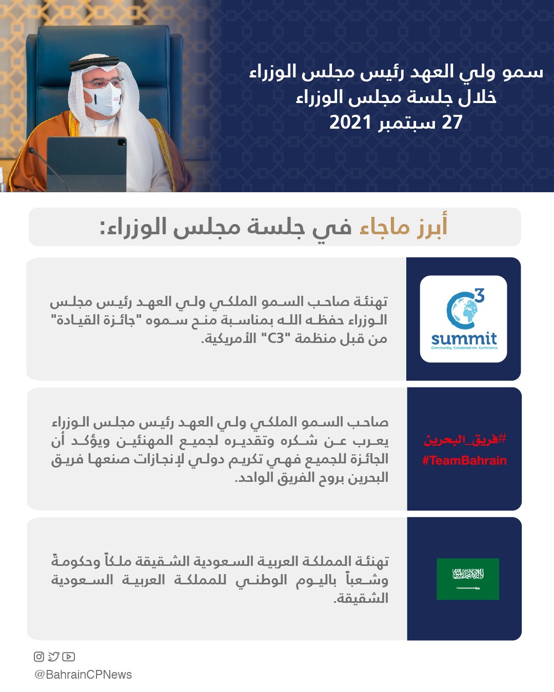 رفع المجلس في مستهل الجلسة أسمى آيات التهاني والتبريكات إلى صاحب السمو الملكي ولي العهد رئيس مجلس الوزراء حفظه الله بمناسبة منح سموه “جائزة القيادة” من قبل منظمة “C3” الأمريكية تكريمًا لإنجازات سموه حفظه الله في مختلف المجالات وقيادته للجهود الوطنية للتصدي لفيروس كورونا (كوفيد-19)، وتقديرًا لدور سموه في تنمية وتوطيد العلاقات بين مملكة البحرين والولايات المتحدة الأمريكية، وقد أعرب صاحب السمو الملكي ولي العهد رئيس مجلس الوزراء عن شكره وتقديره إلى رؤساء وأعضاء جميع سلطات الدولة والمؤسسات الدستورية ورجال السلك الدبلوماسي ورؤساء وأعضاء المجالس البلدية وشركات القطاع الخاص وإلى جميع المواطنين والمقيمين على مشاعرهم الطيبة، مؤكداً سموه بأن الجائزة للجميع فهي تكريم دولي لإنجازات صنعها فريق البحرين بروح الفريق الواحد وبعزم على تحويل التحديات لفرص تحقق مكتسبات جديدة تُضاف للمسيرة التنموية الشاملة بقيادة حضرة صاحب الجلالة الملك حمد بن عيسى آل خليفة عاهل البلاد المفدى حفظه الله ورعاه.
