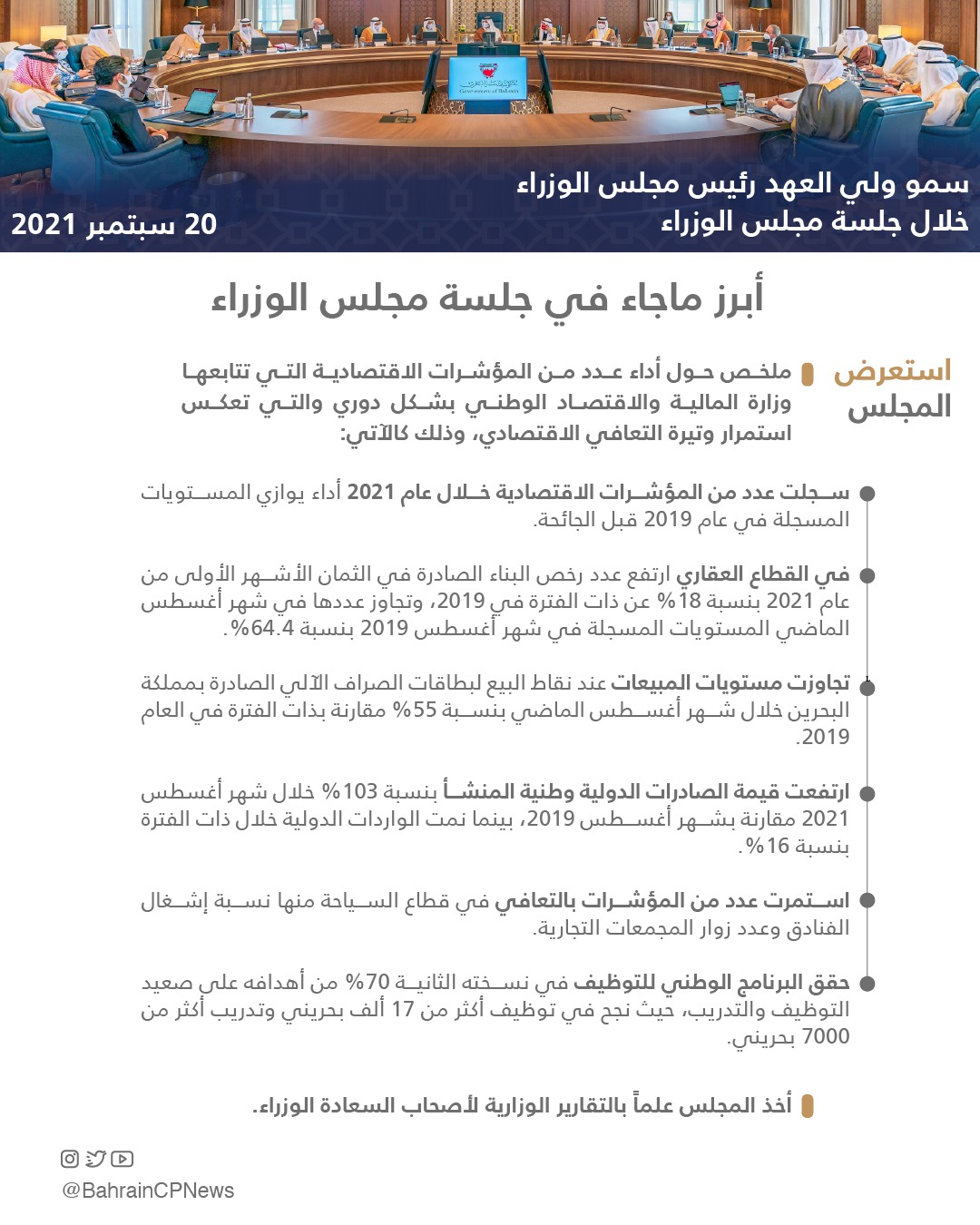– حقق البرنامج الوطني للتوظيف في نسخته الثانية 70% من أهدافه على صعيد التوظيف والتدريب، حيث نجح في توظيف أكثر من 17 ألف بحريني وتدريب أكثر من 7000 بحريني.