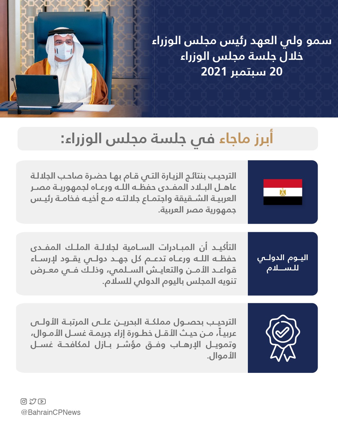 رحب مجلس الوزراء بنتائج الزيارة التي قام بها حضرة صاحب الجلالة الملك حمد بن عيسى آل خليفة عاهل البلاد المفدى حفظه الله ورعاه لجمهورية مصر العربية الشقيقة واجتماع جلالته مع أخيه فخامة الرئيس عبدالفتاح السيسي رئيس جمهورية مصر العربية، منوهاً المجلس بنتائج الاجتماع على صعيد دعم العلاقات الثنائية التي باتت نموذجًا متقدمًا للترابط الأخوي، بالإضافة إلى تعزيز التنسيق المشترك تجاه القضايا والمستجدات الدولية.