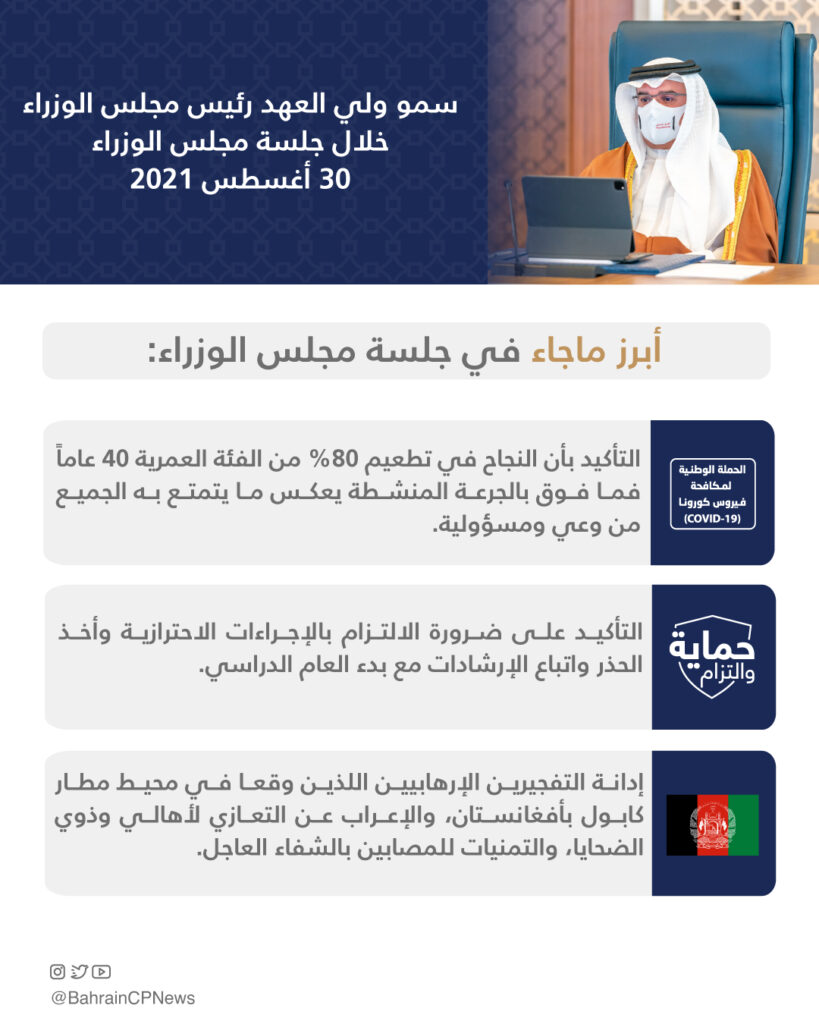 ثم أعرب مجلس الوزراء عن خالص تمنياته بعامٍ دراسيٍ مليئ بالإنجاز والتميز للطلبة والطالبات وللهيئات الأكاديمية والإدارية بمناسبة بدء العام الدراسي الجديد، وأكد المجلس على ضرورة الالتزام بالإجراءات الاحترازية وأخذ الحذر واتباع الإرشادات مع بدء العام الدراسي بما يُسهم في دعم كافة جهود التصدي لفيروس كورونا وحفظ صحة وسلامة الجميع.