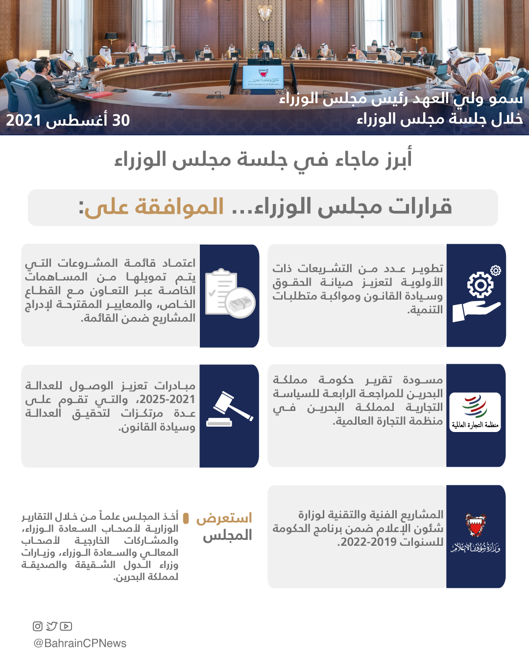ثم أخذ المجلس علماً من خلال التقارير الوزارية لأصحاب السعادة الوزراء، بنتائج زيارة الجمهورية التونسية وجمهورية ألمانيا الاتحادية، والمشاركات الخارجية لأصحاب المعالي والسعادة الوزراء، وزيارات وزراء الدول الشقيقة والصديقة لمملكة البحرين.