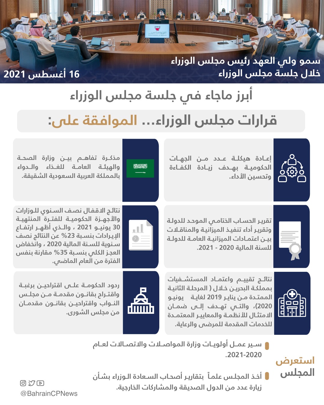 4.مذكرة اللجنة الوزارية للشؤون المالية والاقتصادية والتوازن المالي حول نتائج الاقفال نصف السنوي للوزارات والأجهزة الحكومية للفترة المنتهية 30 يونيو 2021، والذي أظهر ارتفاع الإيرادات بنسبة 23 % عن النتائج نصف سنوية للسنة المالية 2020 ، الى جانب ارتفاع الإيرادات غير النفطية بنسبة 4%. كما انخفضت المصروفات العامة بنسبة 4٪ عن النتائج نصف السنوية للسنة المالية 2020، تشمل انخفاض في المصروفات المتكررة بنسبة2 ٪، مما أدى إلى انخفاض العجز الكلي بنسبة 35٪ مقارنة بنفس الفترة من العام الماضي.