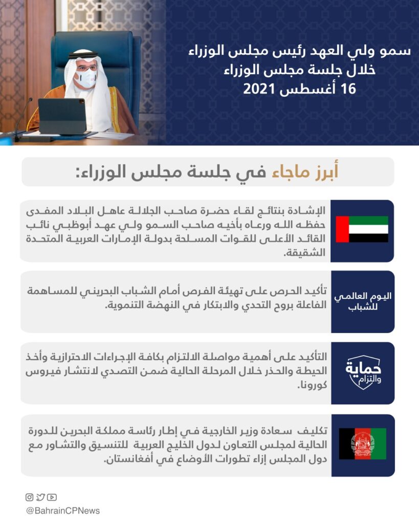 ثم أخذ المجلس علماً من خلال تقارير أصحاب السعادة الوزراء بنتائج مشاركة مملكة البحرين في دورة الألعاب الأولمبية الثانية والثلاثين “أولمبياد طوكيو “2020 ، وتحقيق المنتخب الوطني لكرة السلة للقب البطولة الخليجية السادسة عشرة للمنتخبات للناشئين التي استضافتها مملكة البحرين.