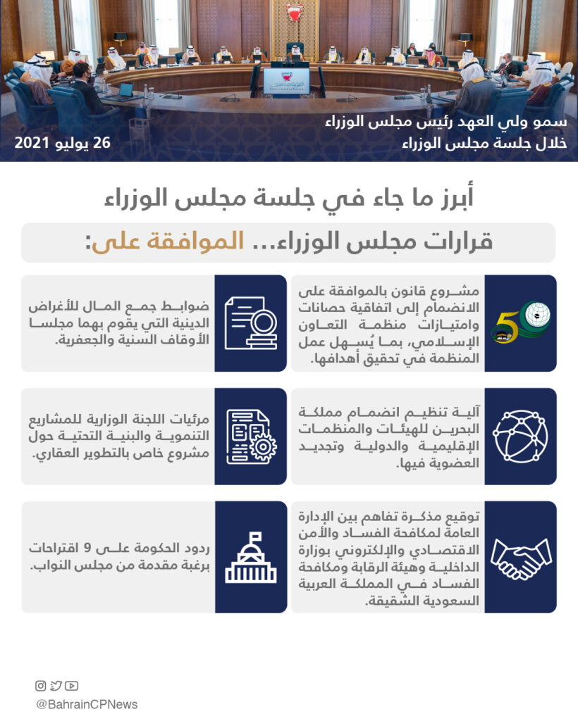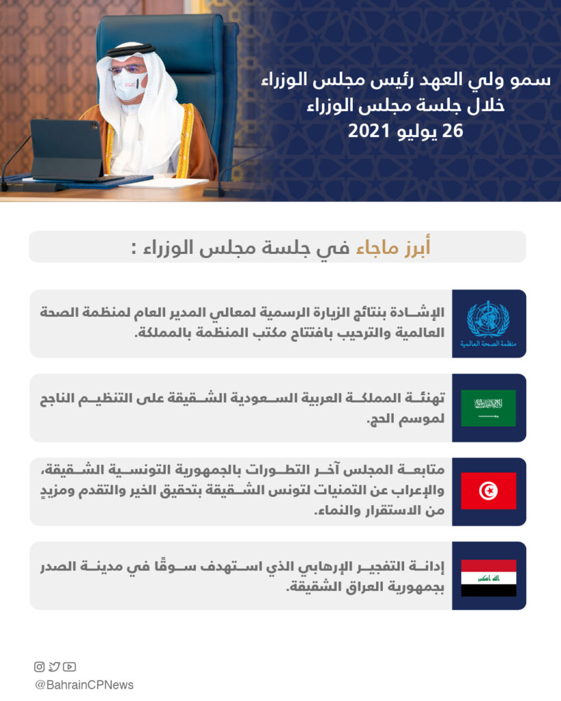 أشاد مجلس الوزراء بنتائج الزيارة الرسمية لمعالي الدكتور تيدروس أدهانوم غيبريسوس المدير العام لمنظمة الصحة العالمية إلى مملكة البحرين وبأهميتها في تعزيز التعاون الثنائي مع المنظمة والاطلاع على تجربة مملكة البحرين في التصدي لفيروس كورونا ، كما رحب المجلس بافتتاح مكتب المنظمة بمملكة البحرين .
