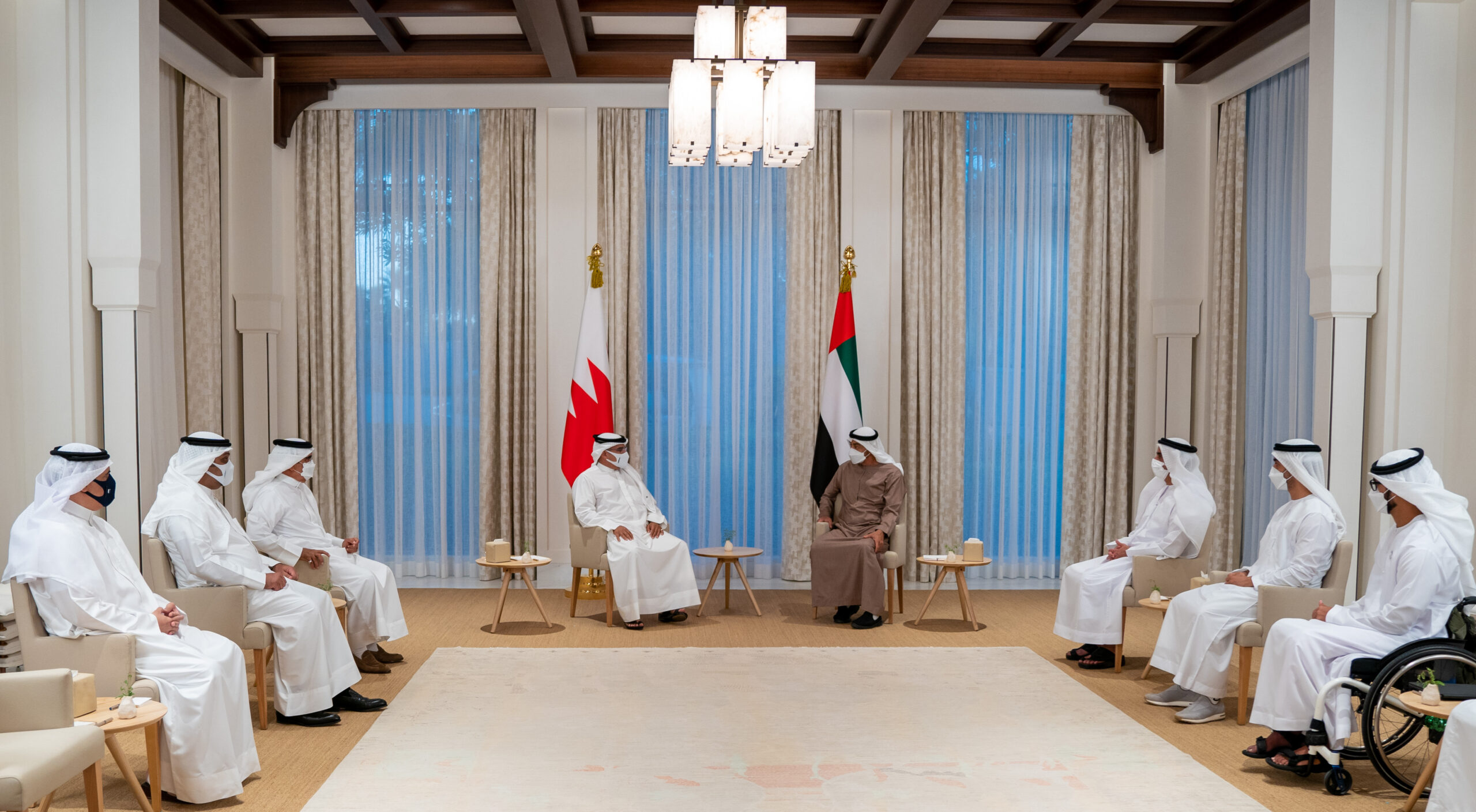جاء ذلك لدى لقاء سموه اليوم مع أخيه صاحب السمو الشيخ محمد بن زايد آل نهيان ولي عهد أبوظبي نائب القائد الأعلى للقوات المسلحة بدولة الإمارات العربية المتحدة الشقيقة، وذلك بمجلس سموه بقصر الشاطئ بحضور الفريق سمو الشيخ سيف بن زايد آل نهيان نائب رئيس مجلس الوزراء وزير الداخلية وسمو الشيخ حمدان بن محمد بن زايد آل نهيان والشيخ زايد بن حمدان بن زايد آل نهيان والشيخ محمد بن حمد بن طحنون آل نهيان رئيس مجلس إدارة مطارات أبوظبي وعدد من أصحاب السمو والمعالي والسعادة المسؤولين بدولة الإمارات العربية المتحدة، والفريق أول ركن معالي الشيخ راشد بن عبدالله آل خليفة وزير الداخلية، ومعالي الشيخ سلمان بن خليفة آل خليفة وزير المالية والاقتصاد الوطني وسعادة الشيخ خالد بن عبدالله بن علي آل خليفة سفير مملكة البحرين لدى دولة الإمارات العربية المتحدة الشقيقة ، في إطار الزيارة الأخوية التي يقوم بها سموه إلى أبو ظبي، حيث نقل صاحب السمو الملكي ولي العهد رئيس مجلس الوزراء تحيات جلالة الملك المفدى حفظه الله ورعاه إلى أخيه صاحب السمو رئيس دولة الإمارات العربية المتحدة وأخيه صاحب السمو ولي عهد أبوظبي نائب القائد الأعلى للقوات المسلحة حفظهما الله، وتمنيات جلالته لدولة الإمارات العربية المتحدة بالمزيد من التقدم والنماء.