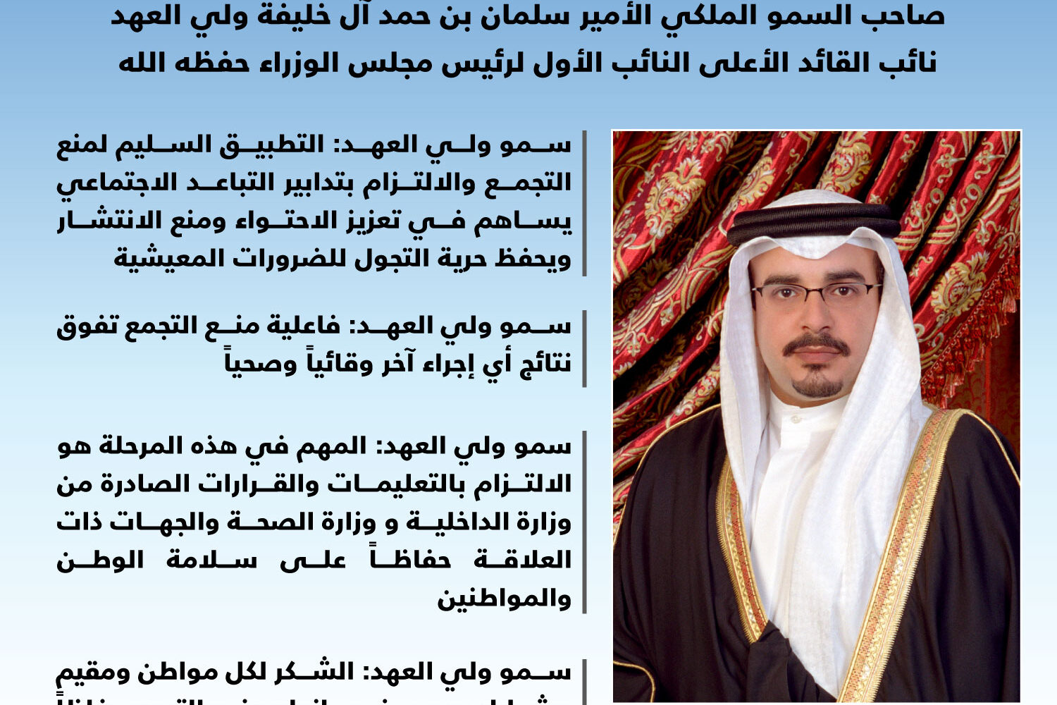 أكد صاحب السمو الملكي الأمير سلمان بن حمد آل خليفة ولي العهد نائب القائد الأعلى النائب الأول لرئيس مجلس الوزراء أن كل مواطنٍ ومقيم اليوم هو مشارك بوعي في إنجاح ما يتم اتخاذه من إجراءات وتدابير لاحتواء ومنع انتشار فيروس كورونا (COVID-19)، وأن المهم في هذه المرحلة هو الالتزام بالتعليمات والقرارات الصادرة من وزارة الداخلية و وزارة الصحة والجهات ذات العلاقة حفاظاً على سلامتهم وسلامة الوطن، معرباً سموه عن شكره وتقديره لكافة المواطنين والمقيمين الملتزمين بالتعليمات والذي يدل على حسهم المسؤول تجاه الوطن وأبنائه وبأنهم شركاءٌ واعون في دعم الجهود الوطنية وإنجاح خطط مواجهة الفيروس؛ فالتصدي لآثاره وانعكاساته يأتي بتكاتف الجميع فالكل عليه القيام بدوره وواجبه من خلال الالتزام بقرار منع التجمعات الذي هو الحل الأنسب لاحتواء ومنع انتشار فيروس كورونا.